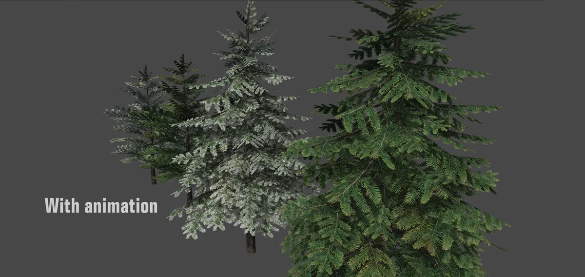 The variety offered by the snowy variants and the separate trunk models allows for a high degree of creative flexibility. When building out a forest, the different configurations—standard, snowy, and trunks—can be mixed to avoid visual repetition. The bone animations add a layer of environmental storytelling, suggesting wind or other physical forces acting upon the world. Because the package contains two distinct versions of each tree type, artists can create a sense of natural variation even within a limited asset set. The focus on fine details and vivid movement makes these pine trees a practical choice for developers looking to populate outdoor environments with ready-to-use, interactive vegetation.