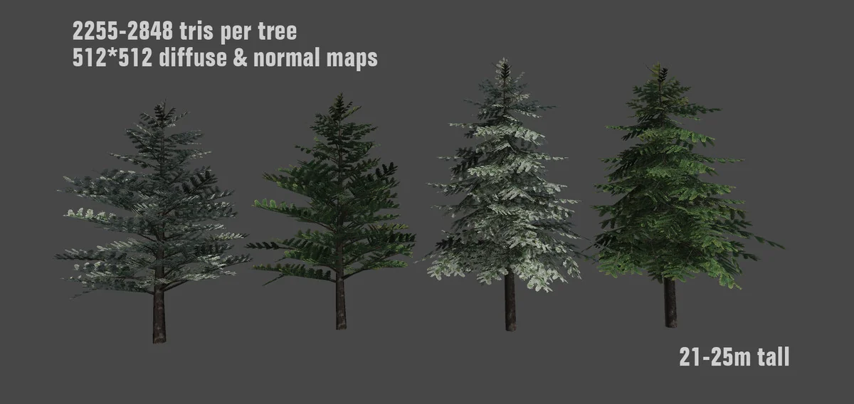 From a technical standpoint, the assets are designed with a specific balance between visual fidelity and performance. The triangle counts for the trees range from 2255 to 2848, placing them in a category that provides enough geometric detail for close-up viewing while remaining manageable for real-time rendering. This geometry is supported by a texture pipeline consisting of 512×512 diffuse and normal maps. The inclusion of normal maps alongside the diffuse textures allows the models to catch light and show surface depth without requiring excessive polygon density. The total asset count within the package reaches 23, providing the underlying components necessary to support the eight primary prefabs.
