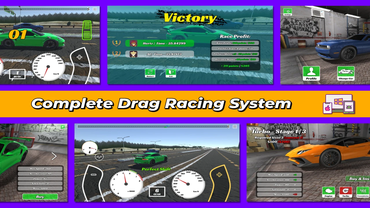 Building a racing game from scratch is a massive undertaking involving complex physics, AI logic, and intricate UI systems. The Drag Racing Framework is here to cut your development time in half. This is not just a script; it is a complete, “game-in-a-box” system designed to get you from an empty scene to a published game as fast as possible.