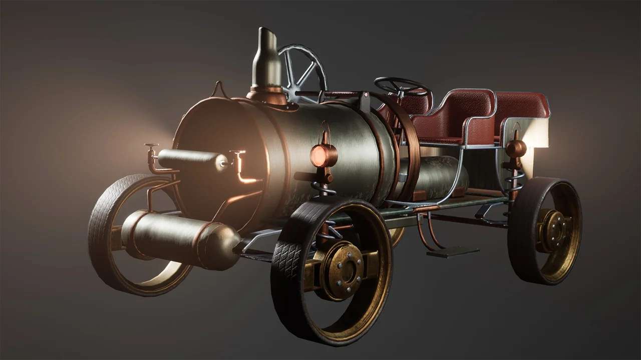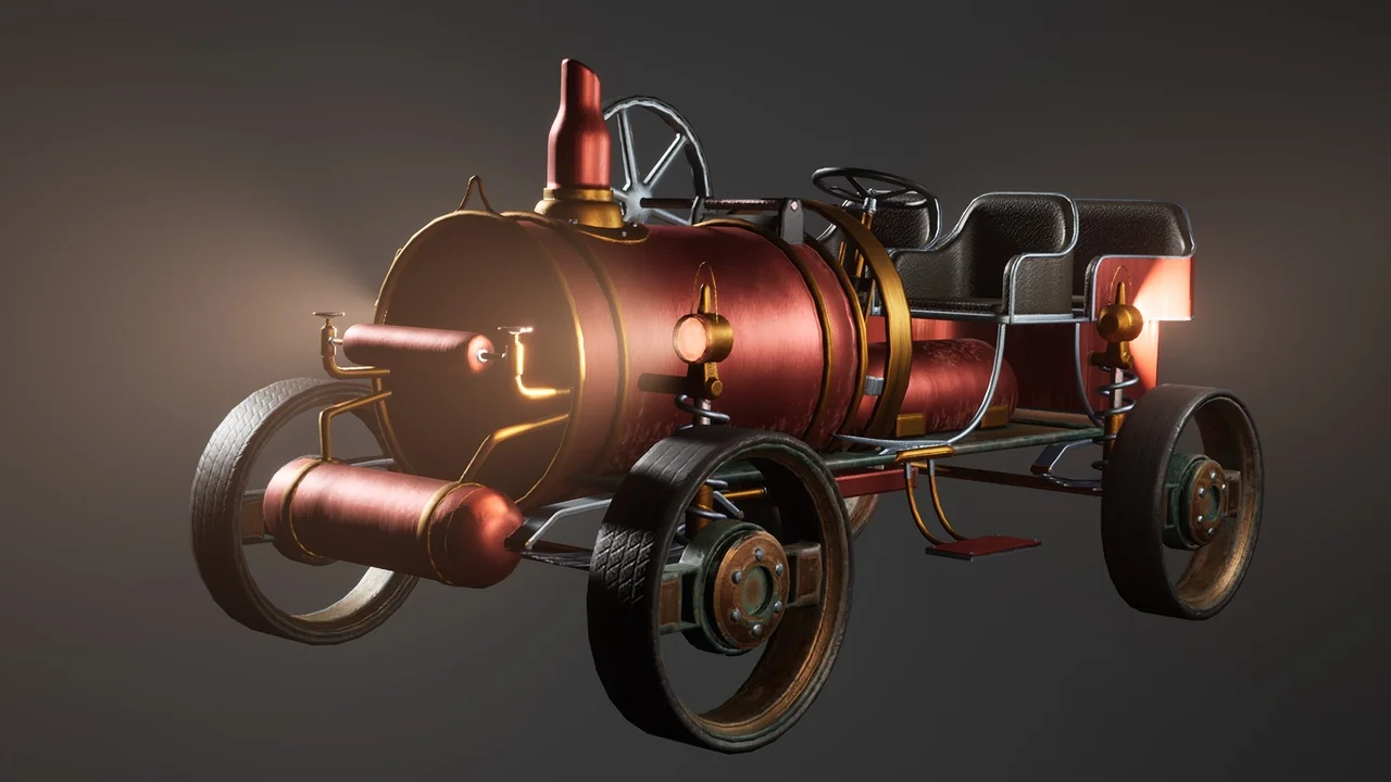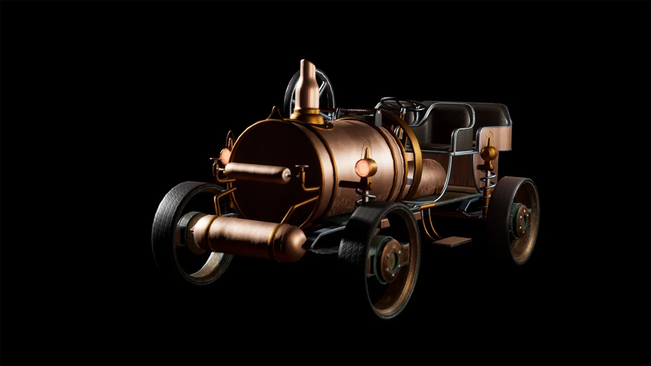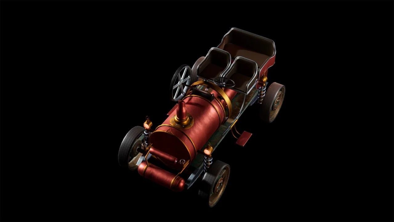 That combination gives the car a specific role in a scene. It can function as a moving gameplay vehicle, but it also works as a strong hero prop when the goal is to anchor a steampunk street, workshop, or concept environment. The model is presented as AAA quality, so it is meant to hold attention in close-view shots as well as wider scene compositions.