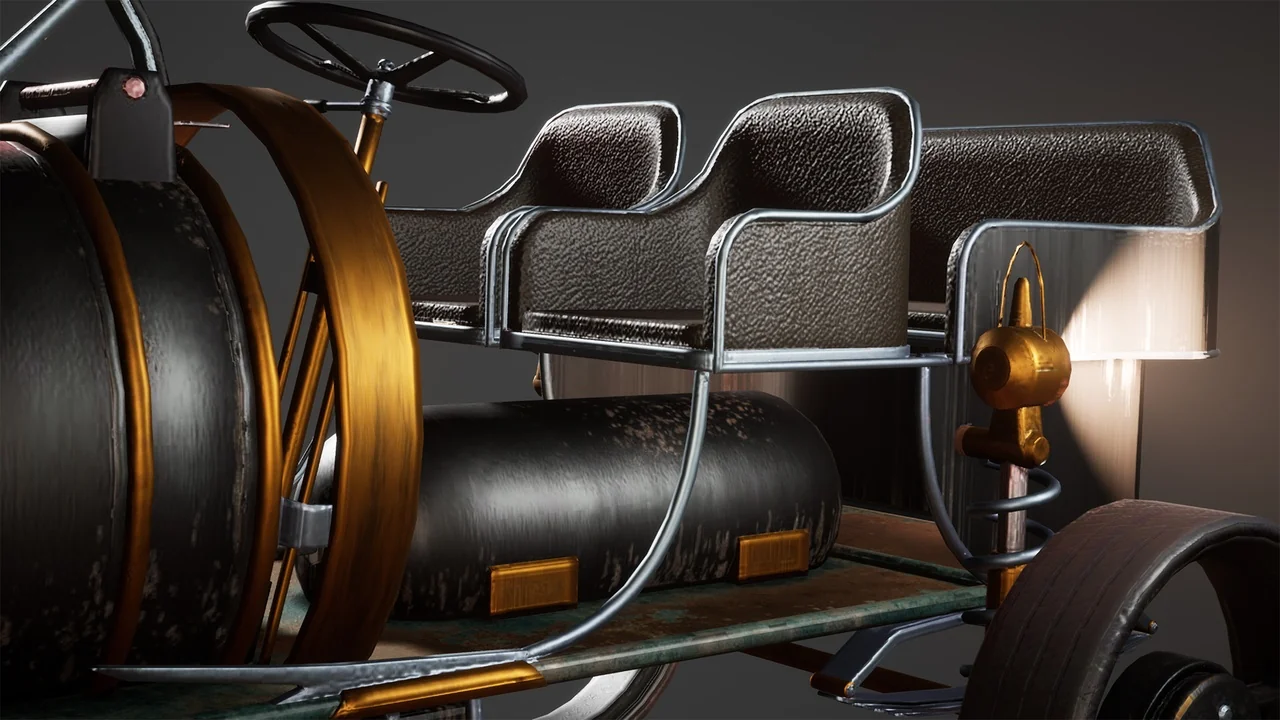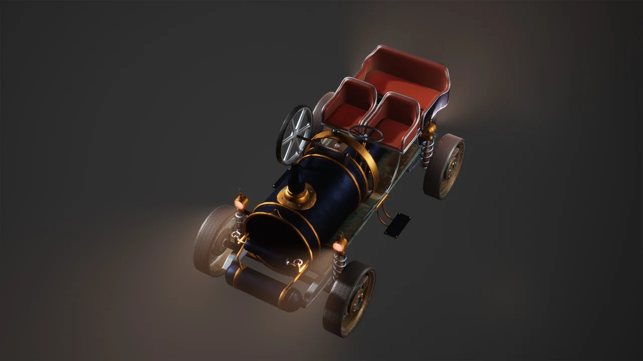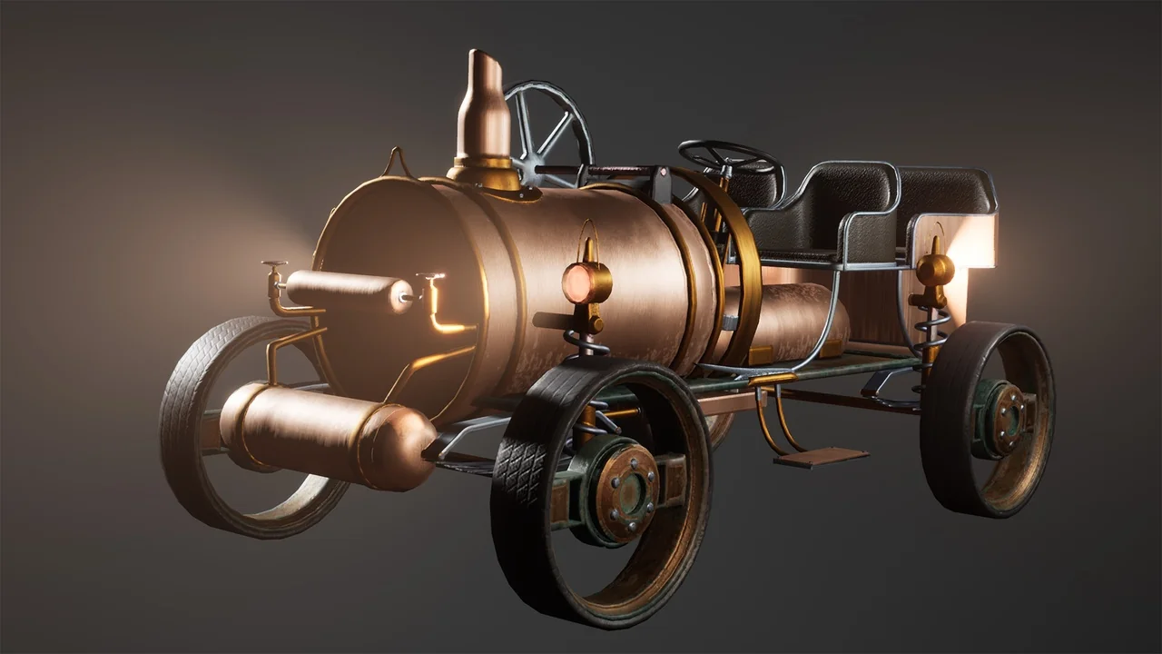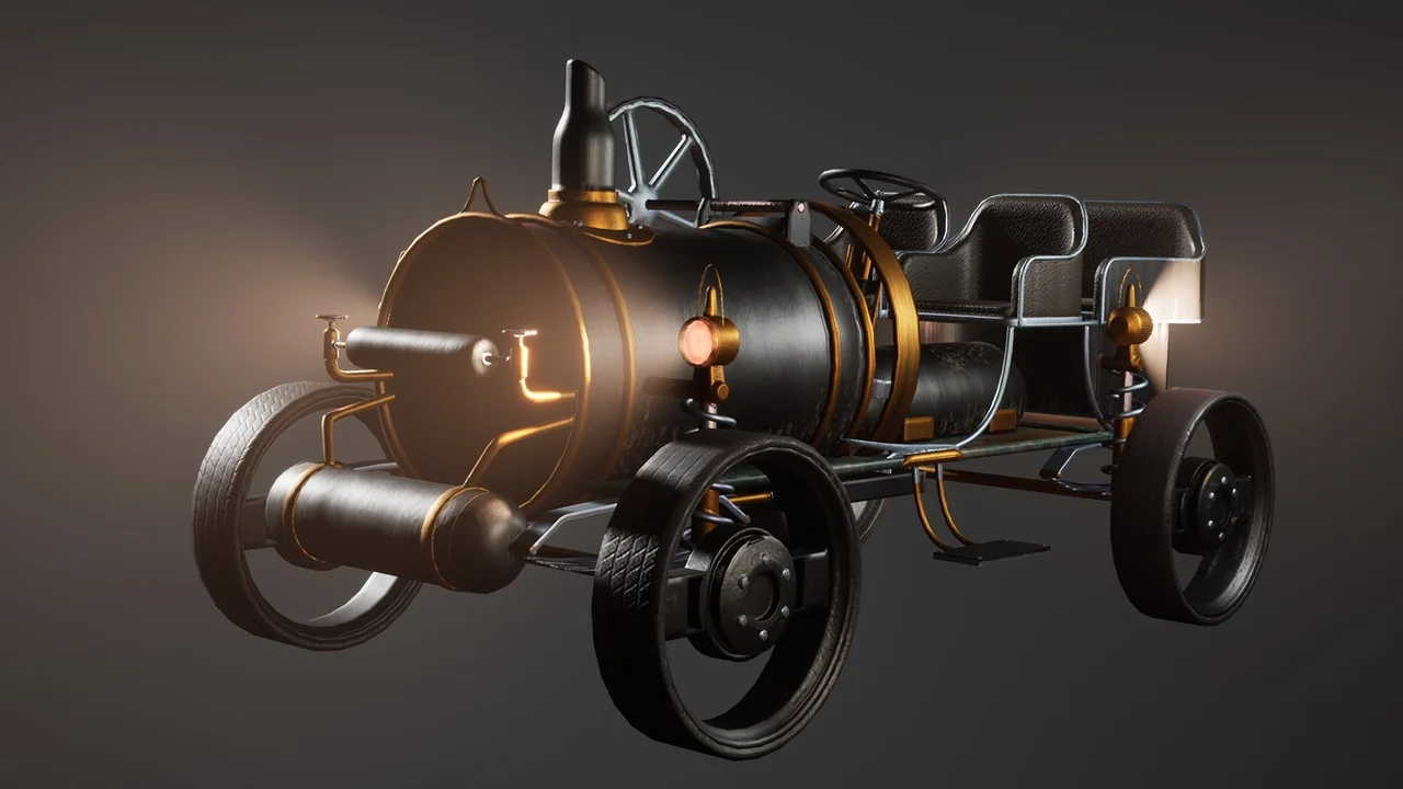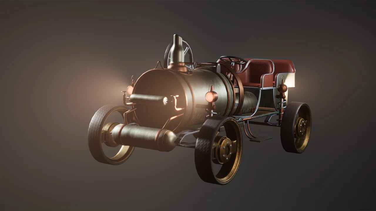 That combination gives the car a specific role in a scene. It can function as a moving gameplay vehicle, but it also works as a strong hero prop when the goal is to anchor a steampunk street, workshop, or concept environment. The model is presented as AAA quality, so it is meant to hold attention in close-view shots as well as wider scene compositions.