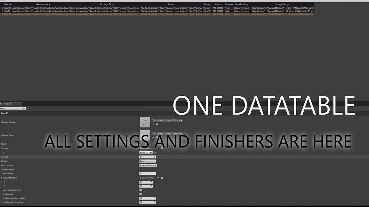 The datatable setup supports several finisher settings, including a multiple hit damage system, taunts, and categories for choosing the right finisher. Those options make it easier to keep different actions organized while still using the same character-alignment workflow.