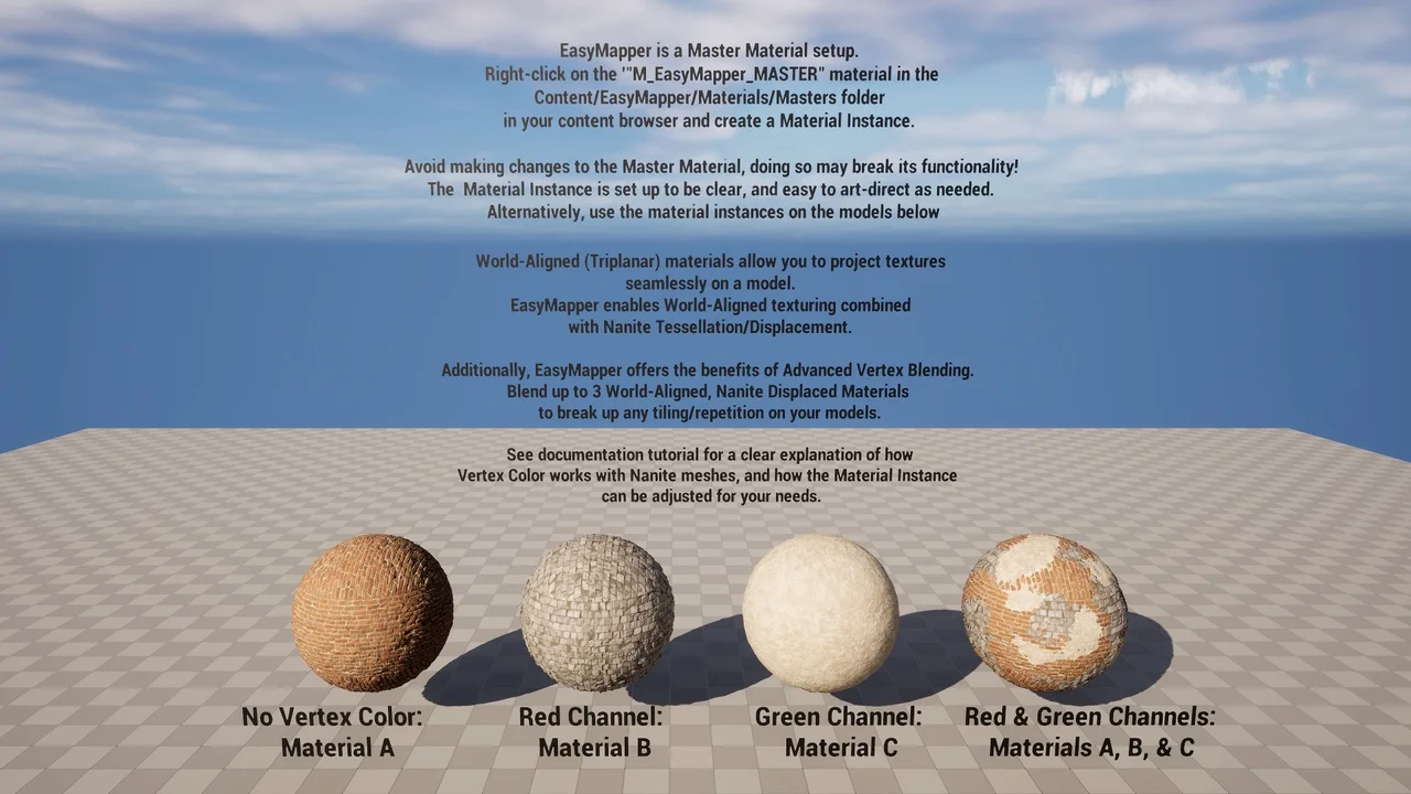 With Easy Mapper, you can project tileable, world-aligned textures across any surface, combined with Nanite displacement, without needing UV’s on your models. EasyMapper’s material instances are cleanly organized for easy art direction, and with a few clicks, you will be able to texture entire levels in moments, and give your models the detail they deserve.