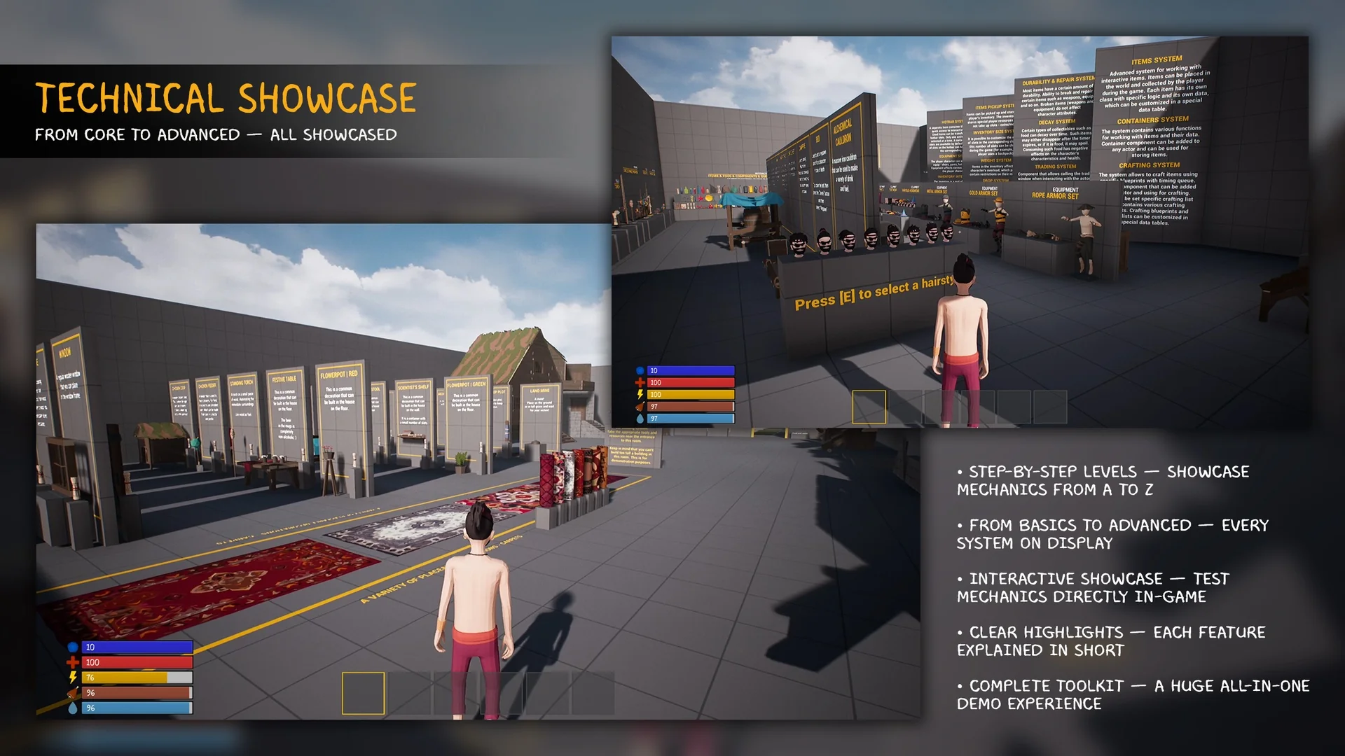 The UI includes custom menus and maps. You get mini and world maps plus a radial menu. Furthermore, the developer provides 300+ pages of documentation. This ensures you can start fast and ship smoother. The Blueprints are fully commented for clarity. This clean architecture avoids spaghetti code. Consequently, it is an ideal foundation for prototyping or complete game development. Everything shown in the official demos is included in the package.