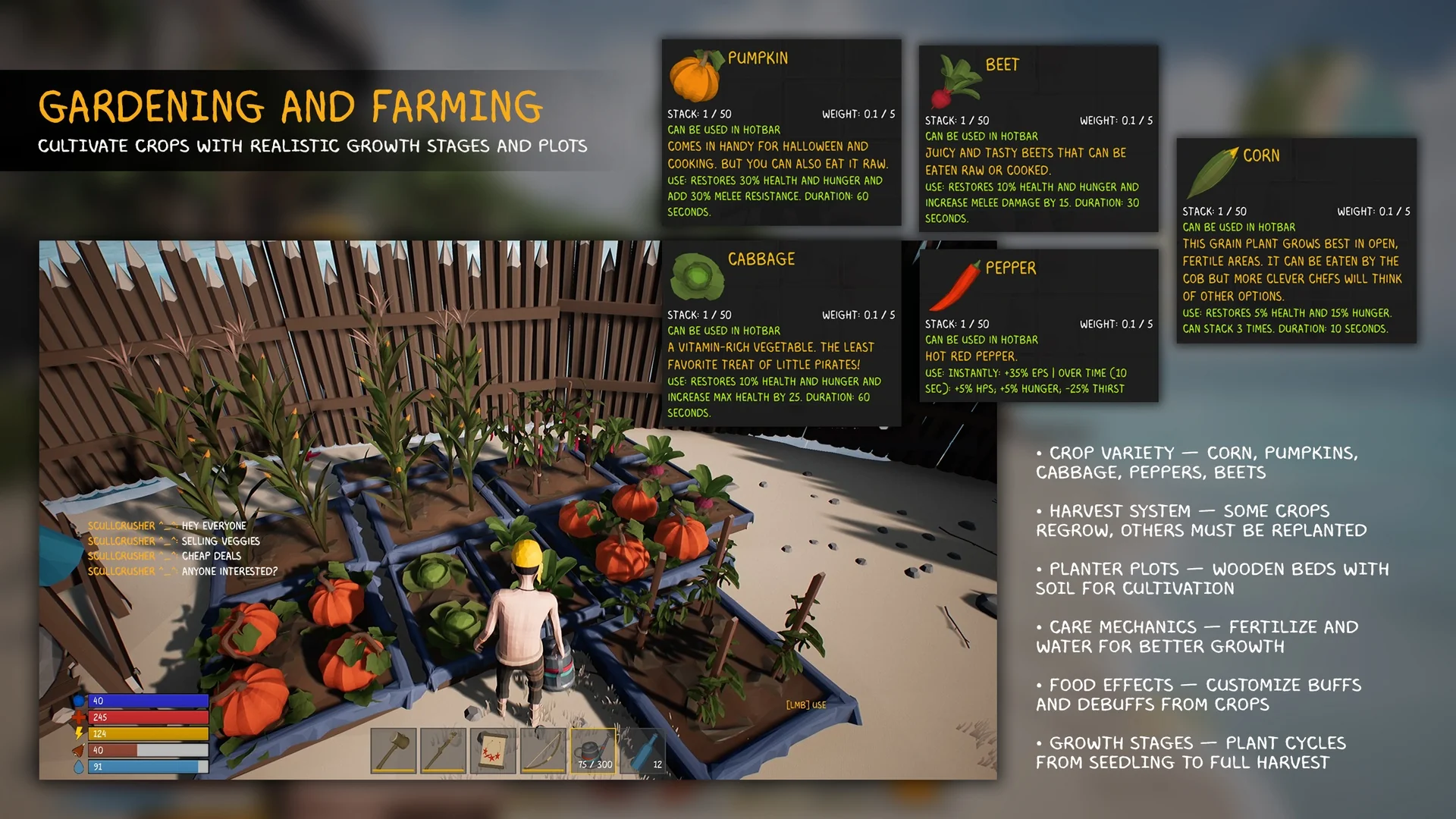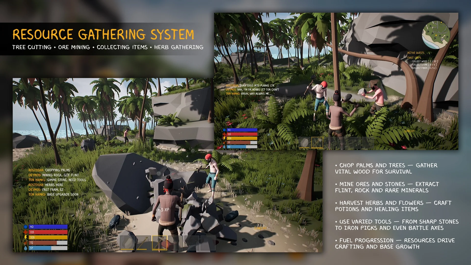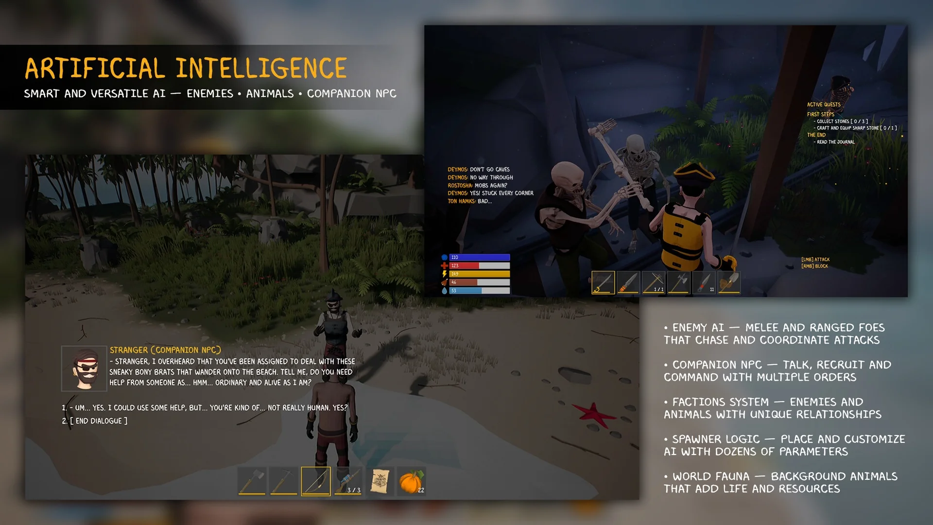 AI and NPCs are smart and utilize behavior trees. They feature ragdoll and IK motion for better realism. Therefore, NPCs can engage in combat, trading, or act as companions. Life simulation features include fishing, digging, and farming. Additionally, you can tame and breed animals with growth stages. The system even includes an emotion system for animals. Characters can progress through skills and leveling while managing survival stats. However, the experience remains immersive through a custom camera and movement system.