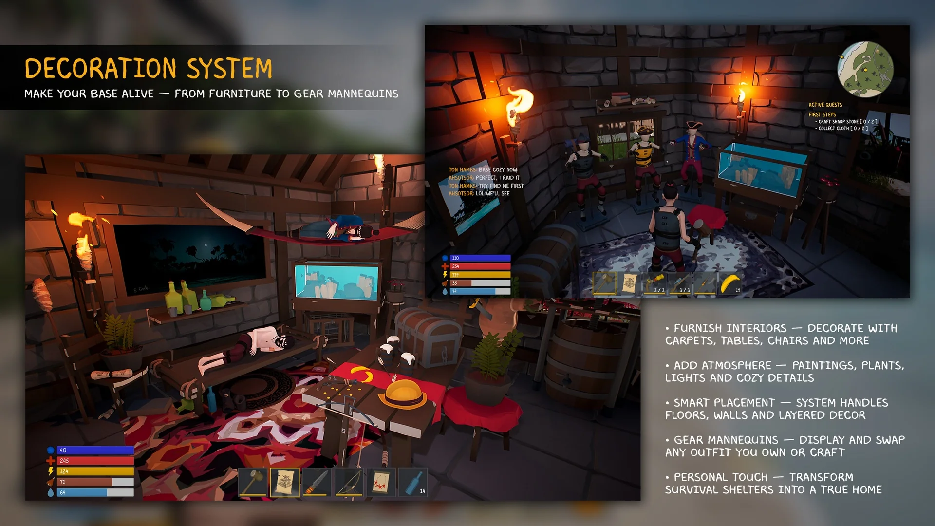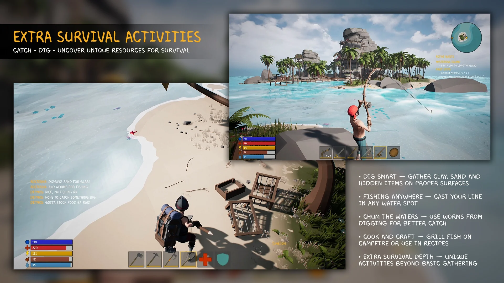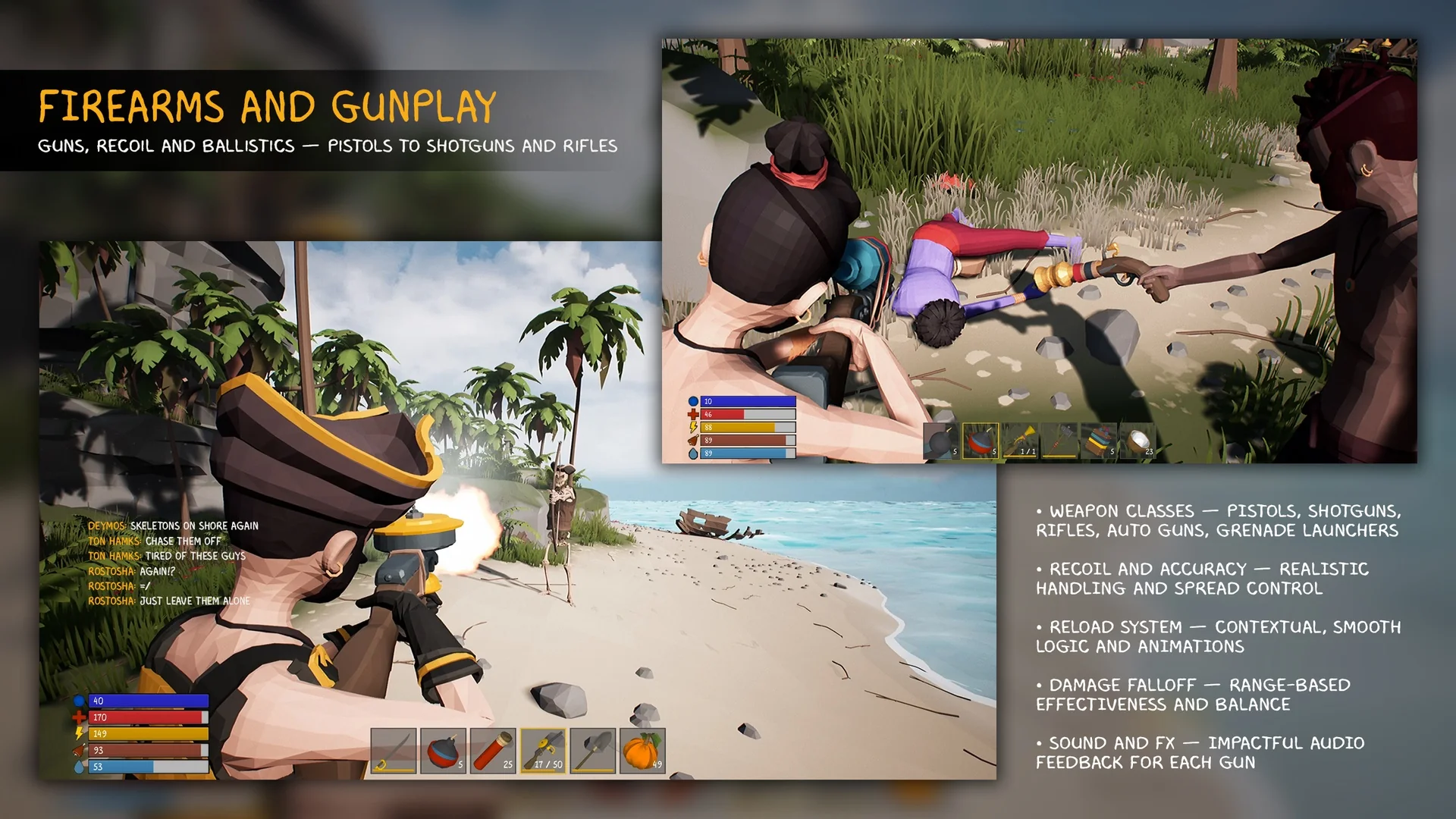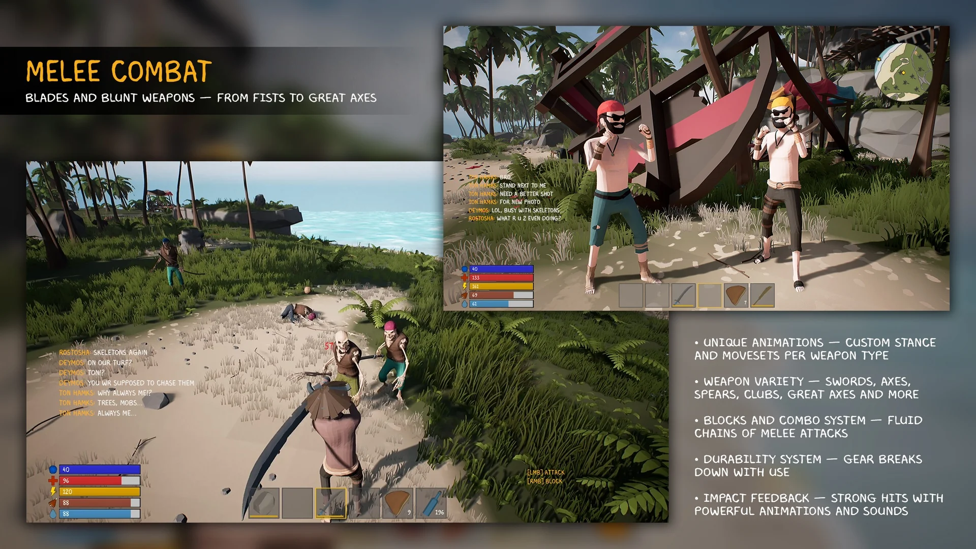AI and NPCs are smart and utilize behavior trees. They feature ragdoll and IK motion for better realism. Therefore, NPCs can engage in combat, trading, or act as companions. Life simulation features include fishing, digging, and farming. Additionally, you can tame and breed animals with growth stages. The system even includes an emotion system for animals. Characters can progress through skills and leveling while managing survival stats. However, the experience remains immersive through a custom camera and movement system.