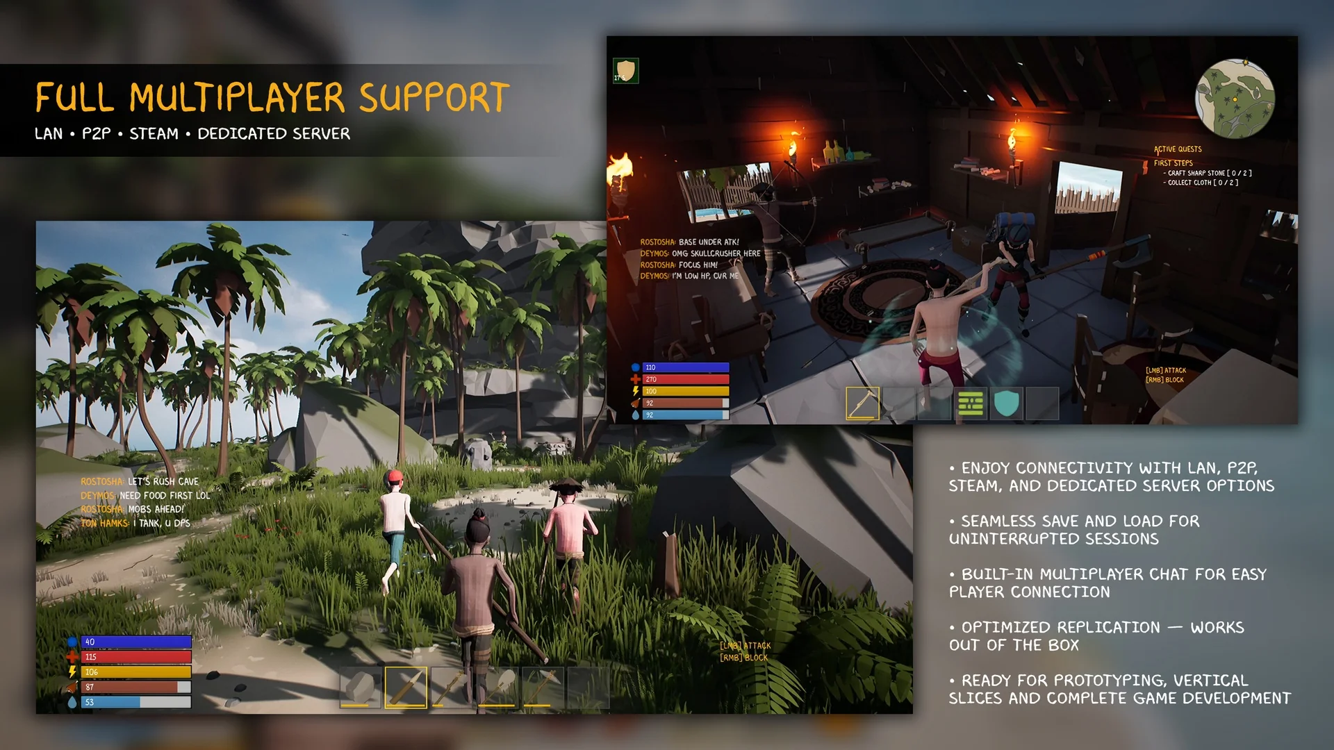 Easy Survival RPG V5 is a production-ready modular template for multiplayer Survival and RPG projects. It allows developers to turn years of work into hours. This template features replicated multiplayer and server-side saves. Consequently, it works out of the box for various game types. The networking system is robust and supports LAN, P2P, Steam, and Dedicated Servers. Therefore, you can invite friends and play in minutes. Additionally, the system includes integrated chat and server-side loading.