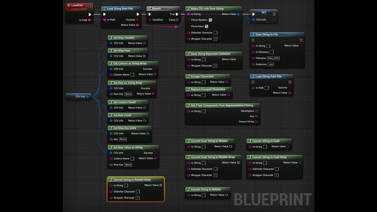 - Runtime parsing of CSV text files in blueprints or C++.