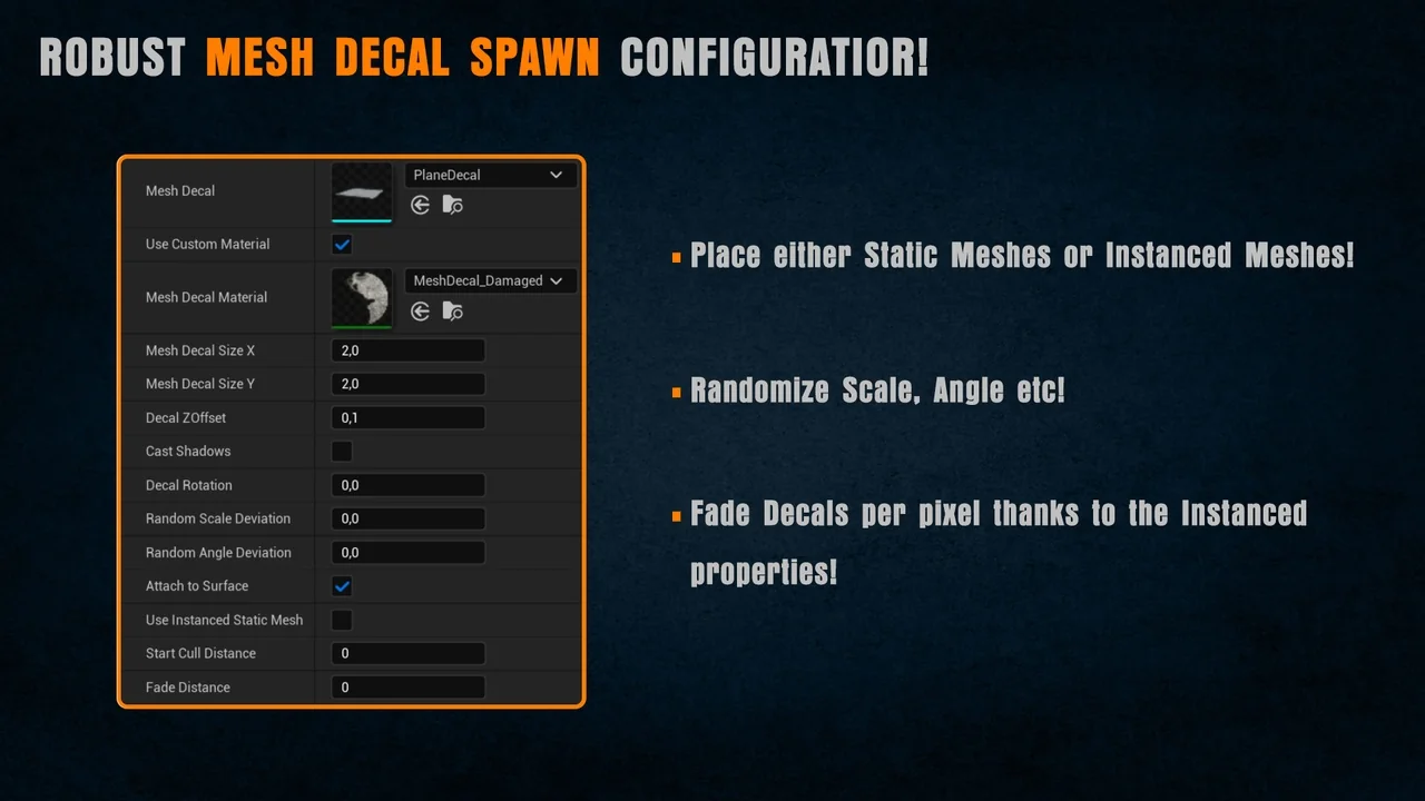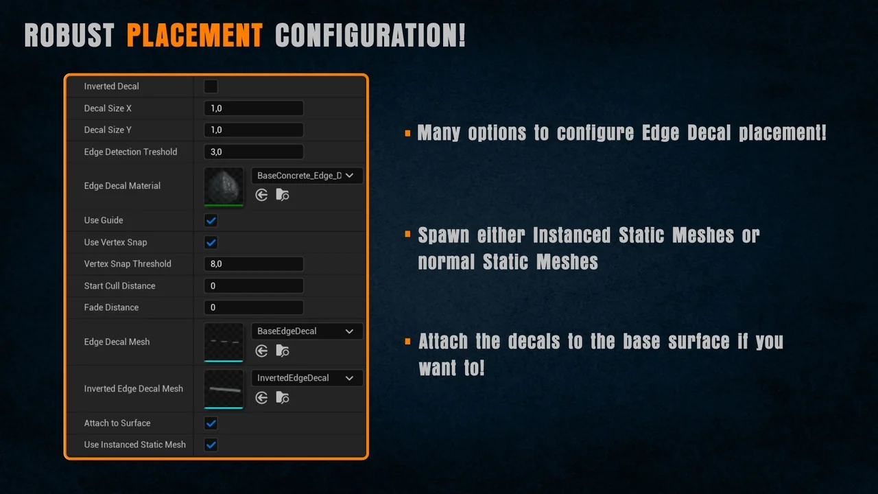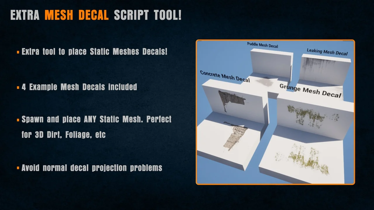 In addition to edge decals, the developer has included a bonus Mesh Decal Tool. This tool allows you to place static meshes across surfaces using an intuitive workflow. Specifically, these mesh decals can function as regular static meshes or instanced static meshes. This flexibility is vital for performance optimization in dense game environments. Moreover, the tool is perfect for modular or layered detail work.