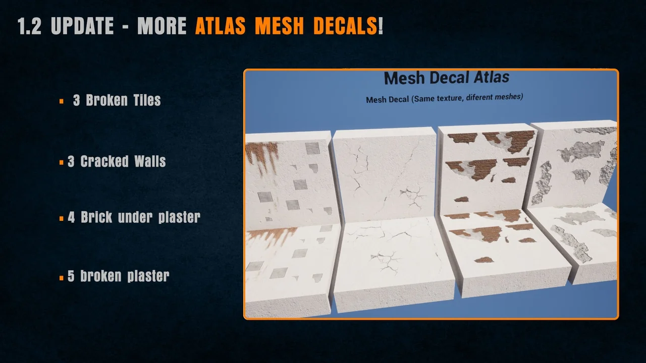The system is compatible with any surface or material type, including brick, stucco, and concrete. If you change the underlying material, the decals remain intact and continue to function flawlessly. Furthermore, a smart material scaling system prevents texture stretching. Decals automatically adapt their scale based on the edge length, which maintains visual consistency across the scene.