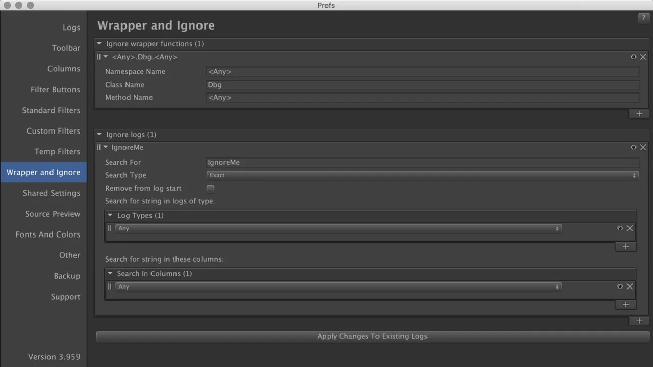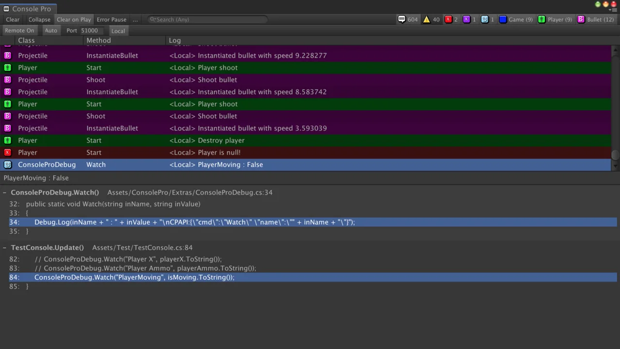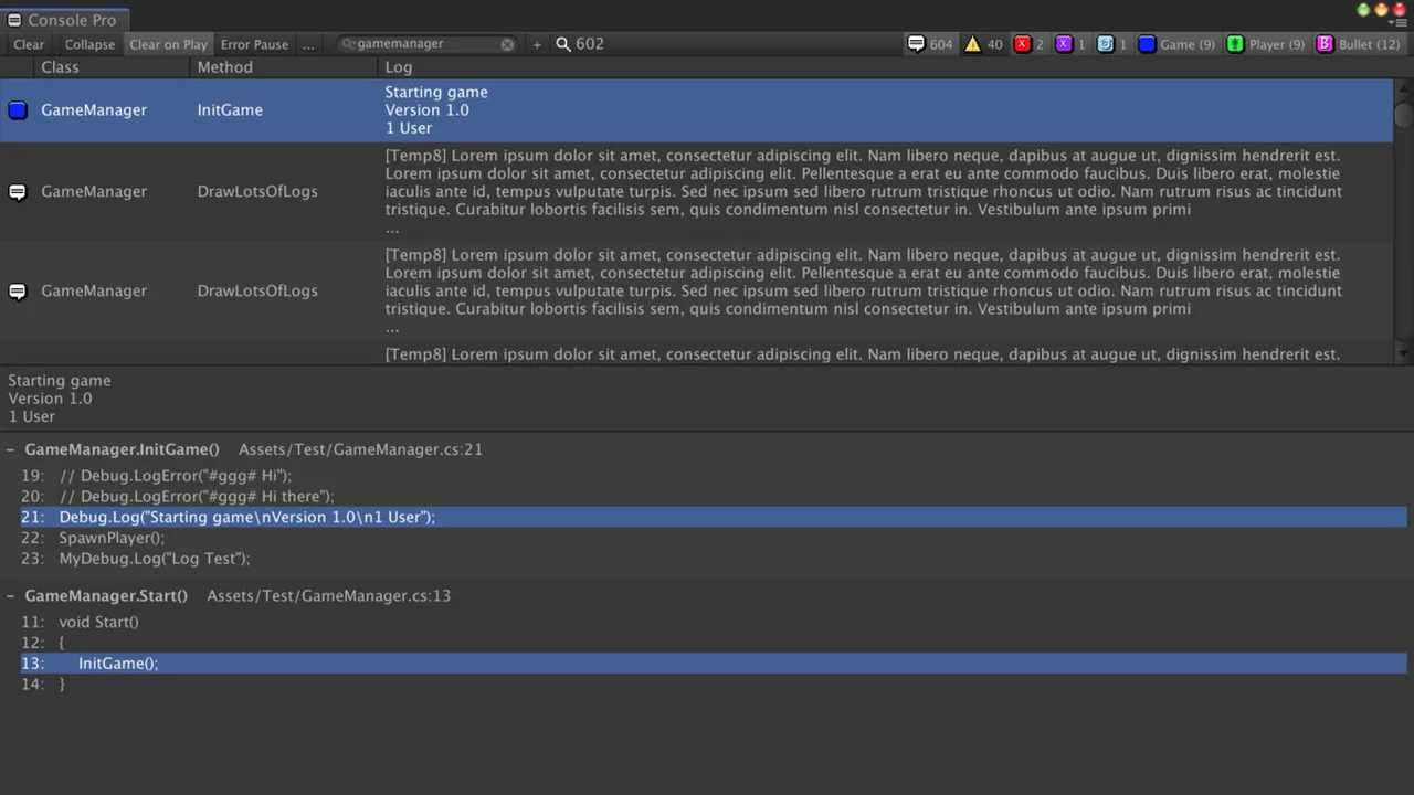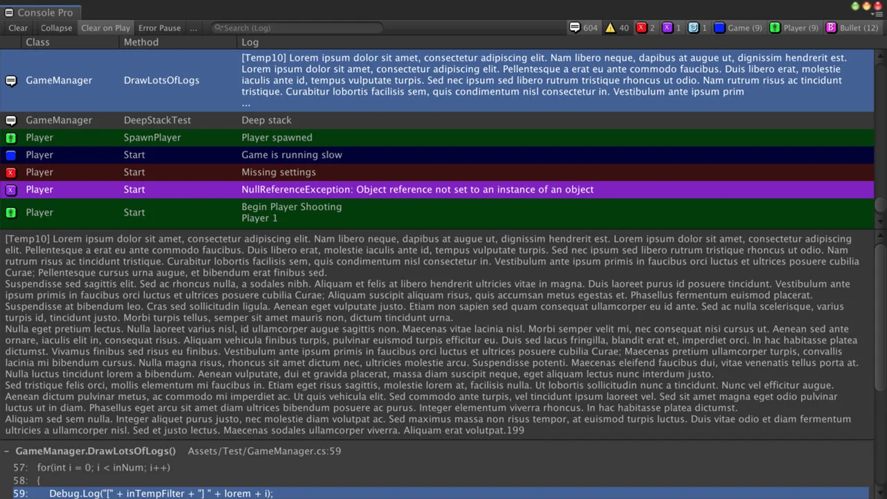 – Easily see a log entry’s file name, namespace, GameObject name, and class in columns.