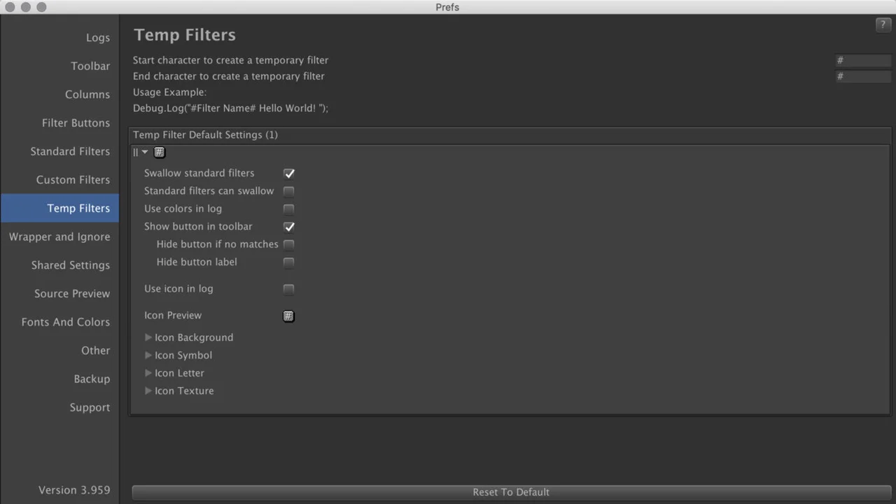 – Create custom filter groups with their own colors, icons, and toggle buttons, instead of just the default Logs, Warnings, and Errors.