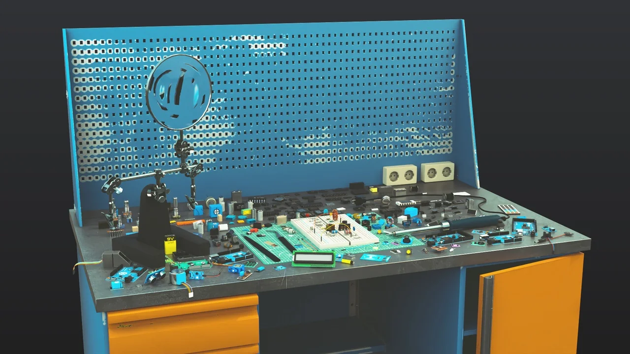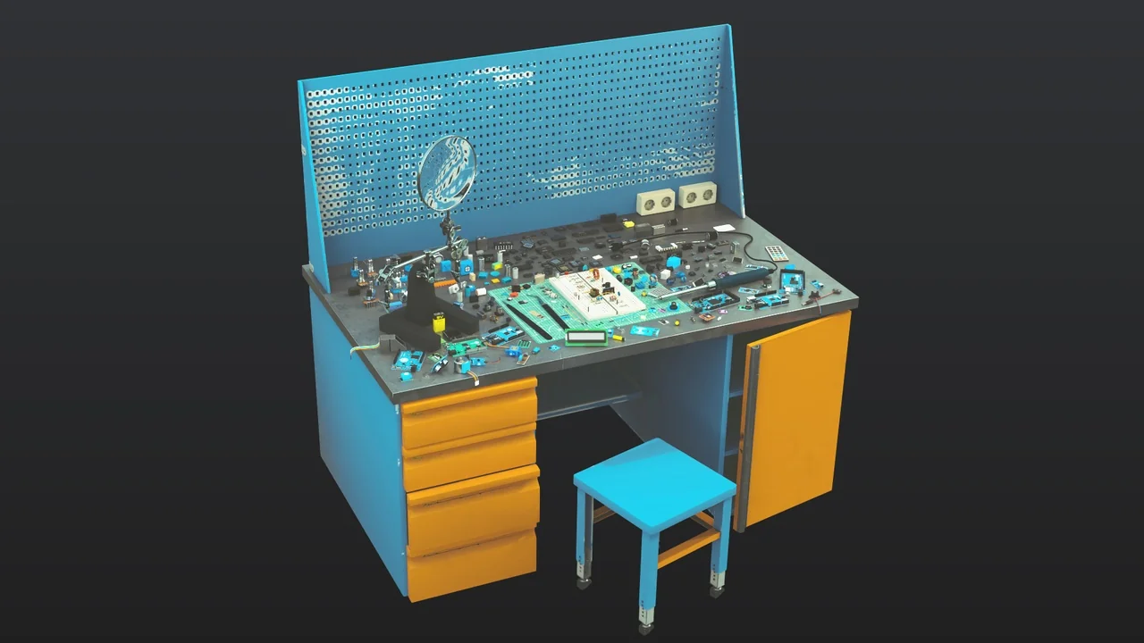 The included support items make the collection suitable for a production workflow that needs an electronics bench already in place. A table and stool establish the working area. A loupe, soldering iron, tools, and layout mat reinforce the feeling of hands-on assembly. The power socket and prototyping board add more of the practical structure that belongs in a setup where components are being tested or connected.