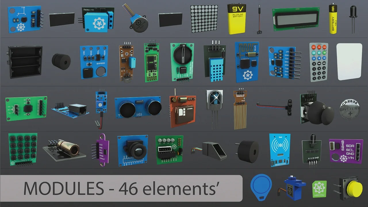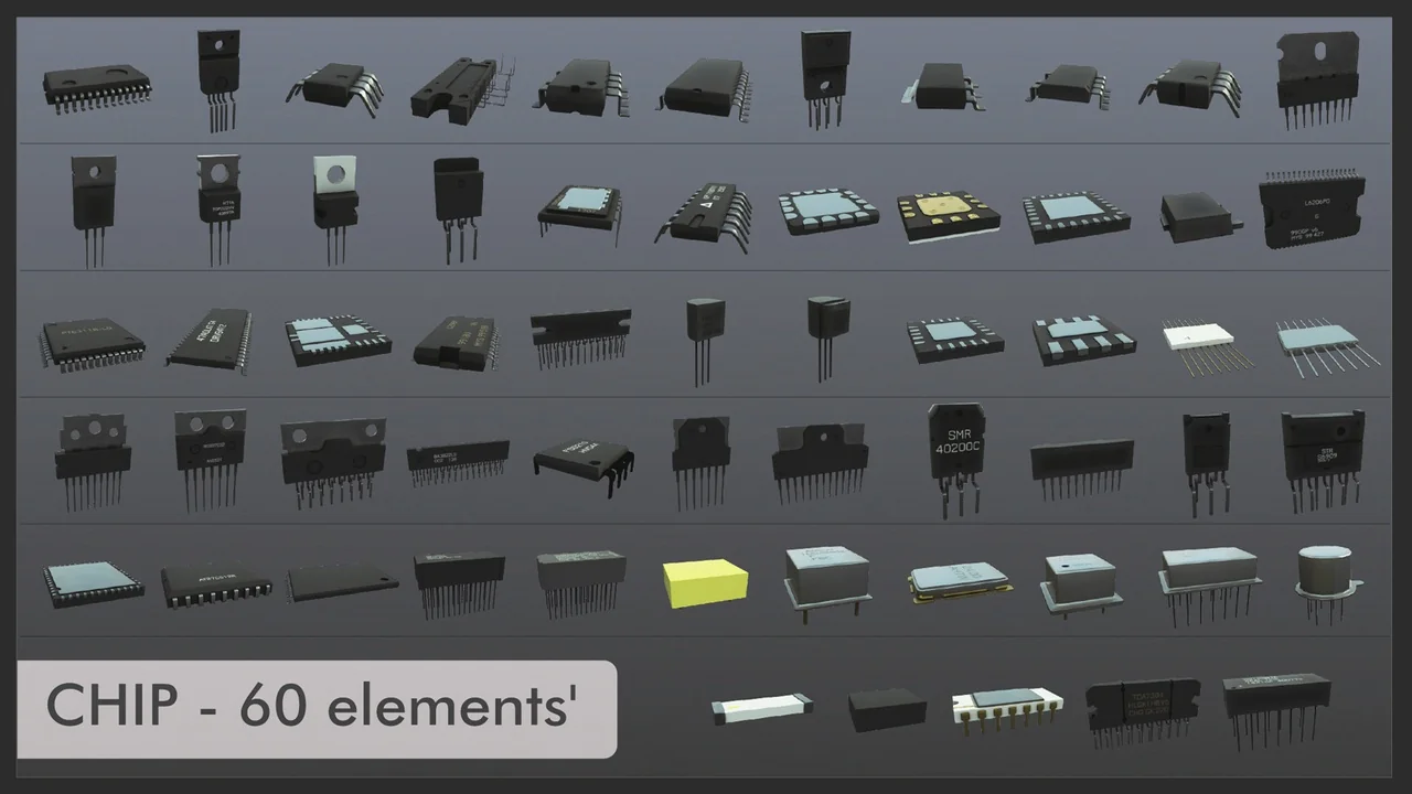 Electrocomponents kitbash is a practical set of electrical parts and workbench pieces that fits naturally into electronics-heavy scenes. It combines component groups, small support items, connected breadboard wires, and board blueprints for LED animation, so the collection can support both detailed prop dressing and functional-looking setup work.