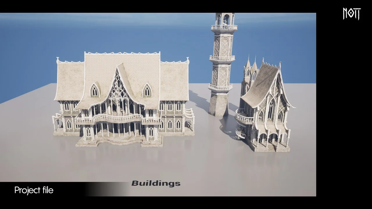 The asset also fits naturally into fantasy production needs because the tag set points to a broad mix of scene types: modular, mansion, fantasy, town, house, elf, building, castle, elven, architecture, and city. Those keywords line up with how the pieces can be used in a level that needs both character and repetition control.