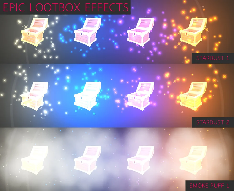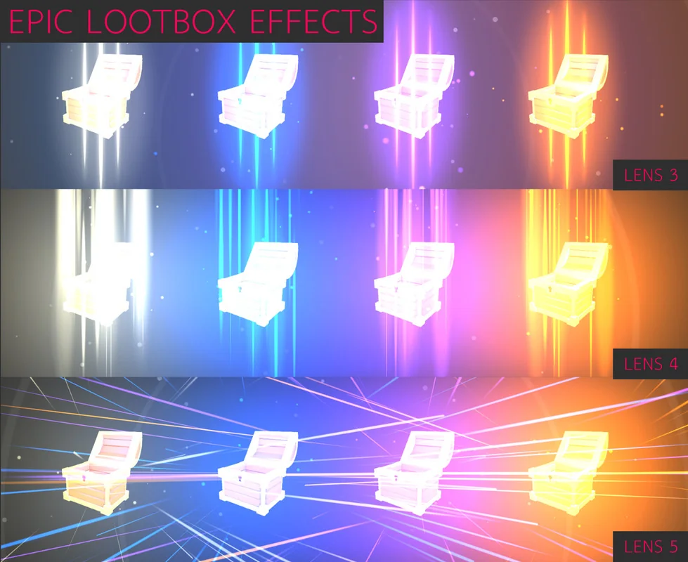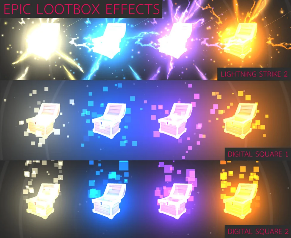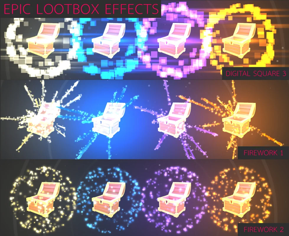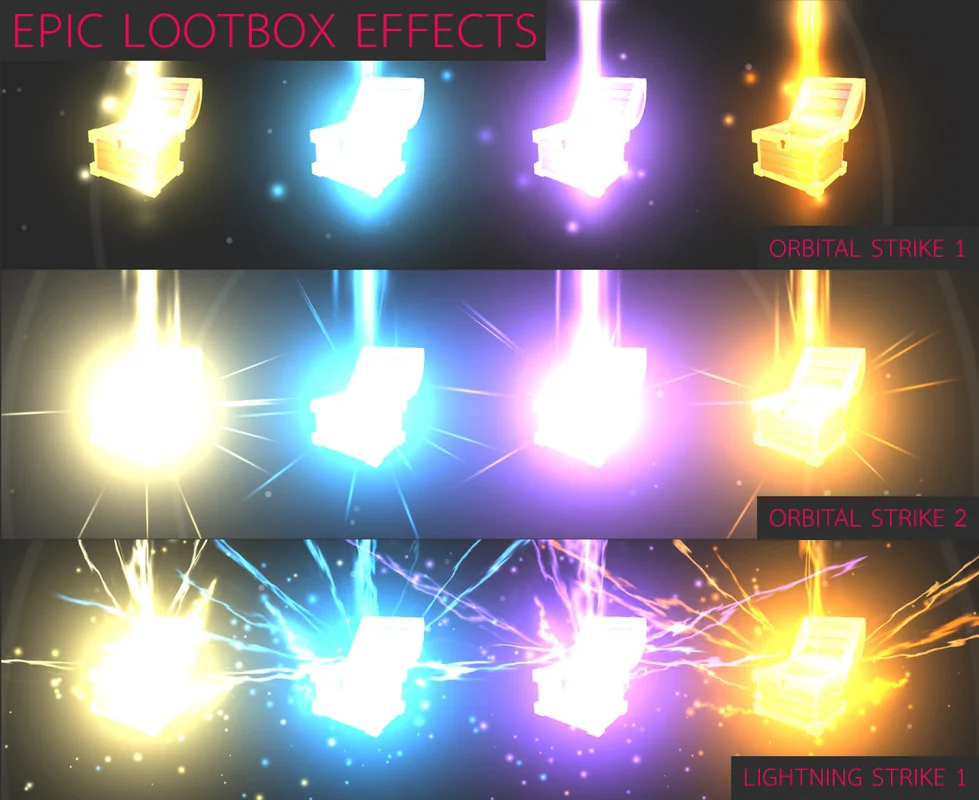 The core idea is simple: each lootbox effect includes rarity variations. That makes it easier to match the visual response to the reward tier without having to build separate particle setups from scratch for every opening animation.