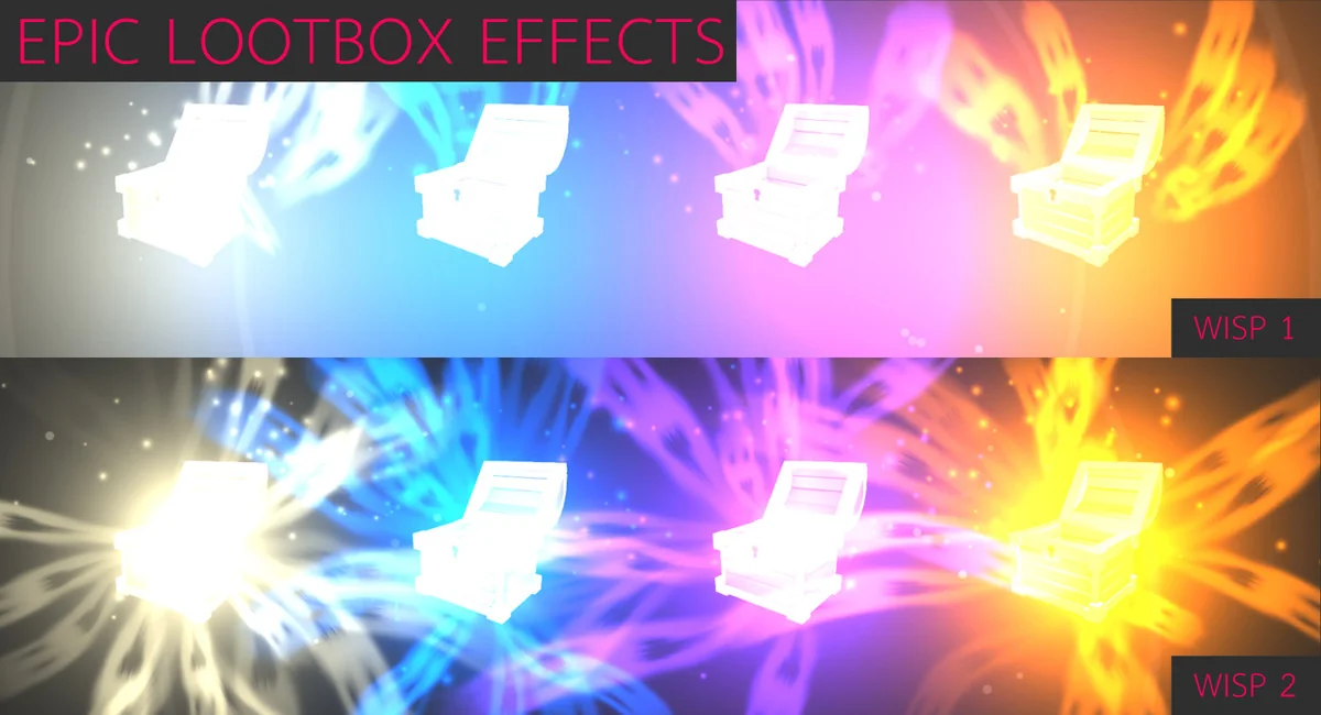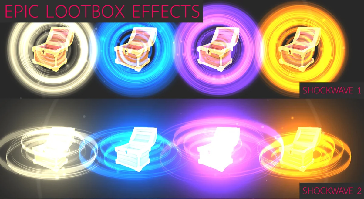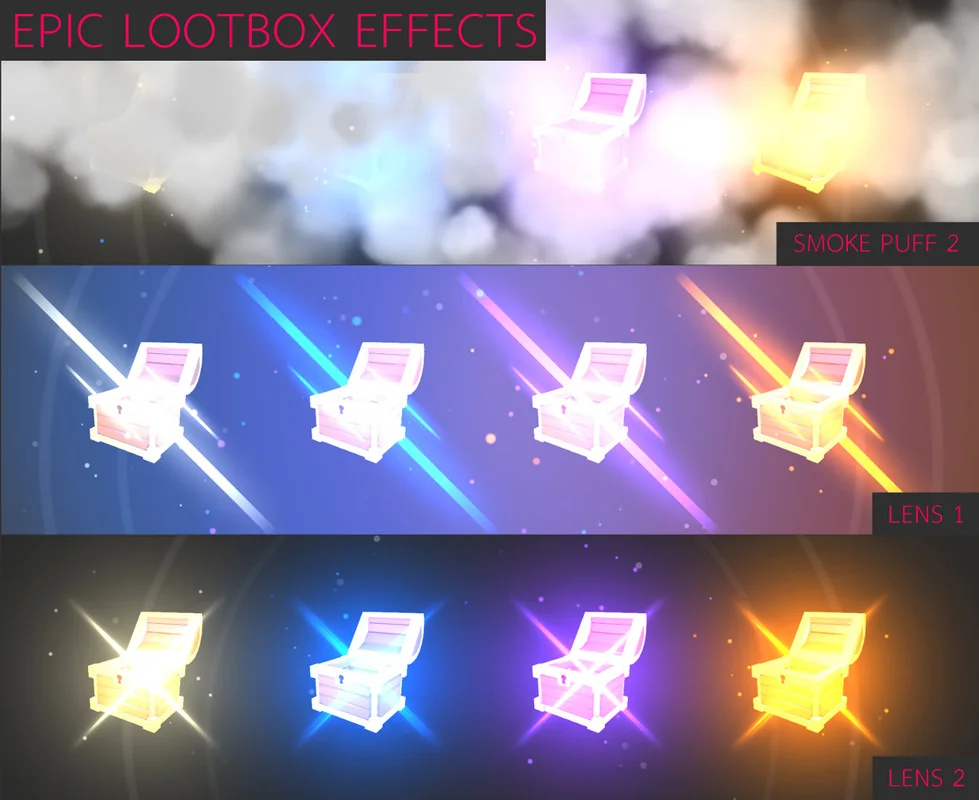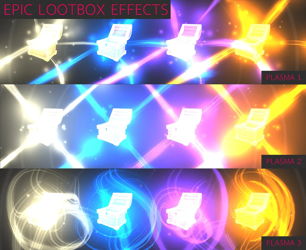 The core idea is simple: each lootbox effect includes rarity variations. That makes it easier to match the visual response to the reward tier without having to build separate particle setups from scratch for every opening animation.