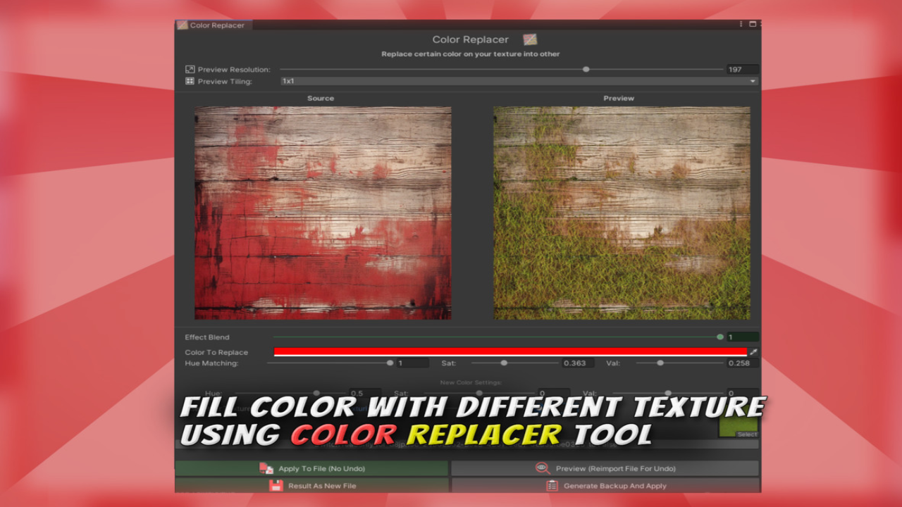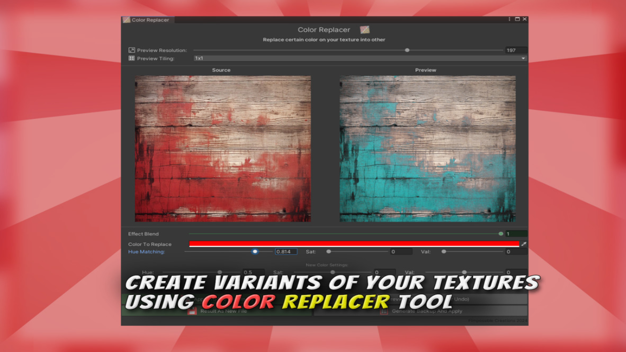 🎨 The plugin features algorithms like Seamless Texture Generator (edges stamp), Color Equalizer (delighter+texturizer), Color Replacer (selective color editor), RGBA Channel Generator, and other RGBA Channel tools, as well as quick file scaling tools (don’t get it wrong – it’s not an AI upscale, it’s basic lanczos scaling).