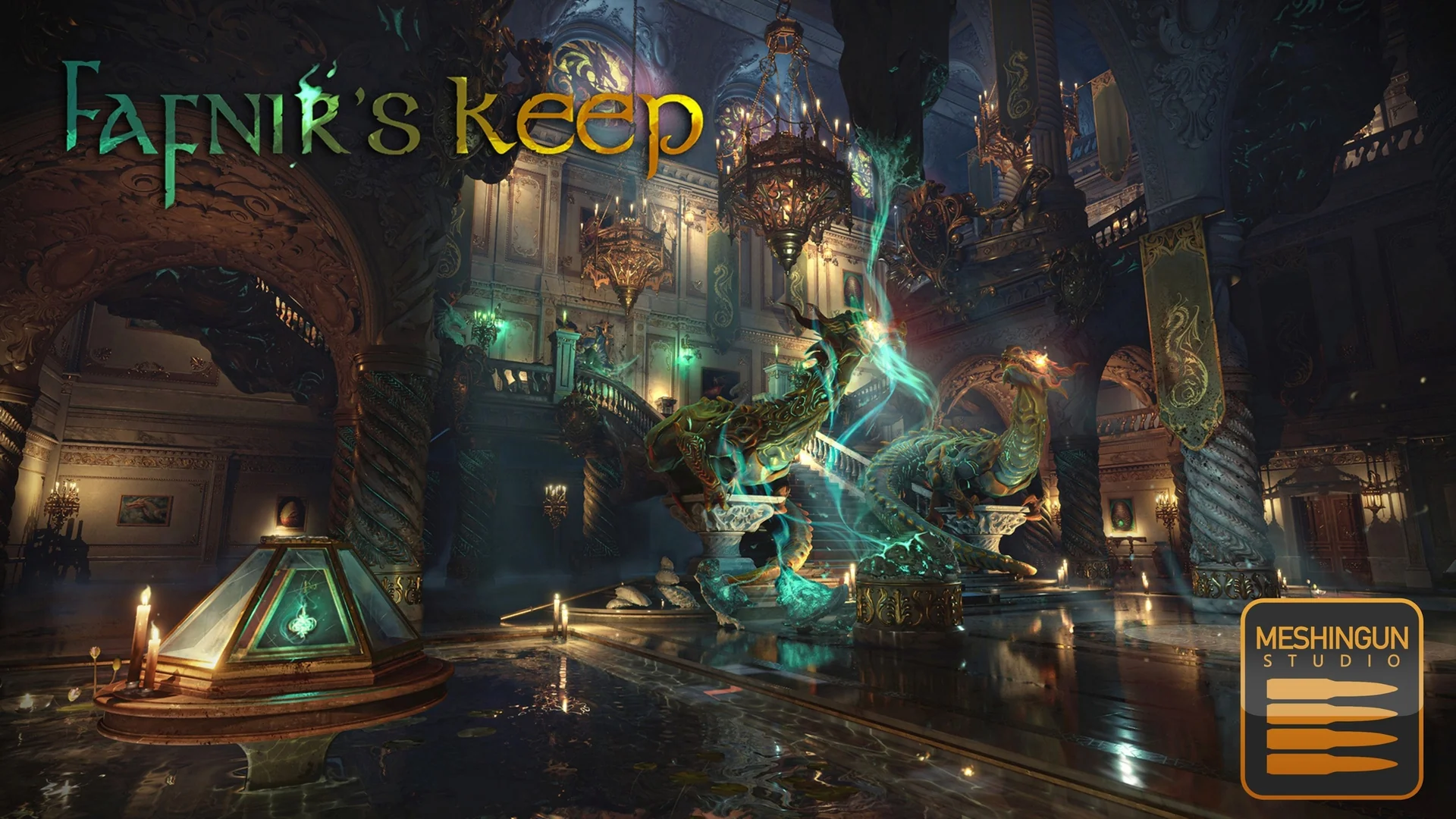 Fafnir’s Keep places players inside a medieval fantasy environment with a polished, atmospheric look. The setting leans into detailed architecture and lighting that give the space a sense of grandeur and mystery without relying on a separate build-out phase. A fully laid-out showcase map is included, so the environment can be viewed as a complete scene rather than as loose parts waiting to be assembled.
