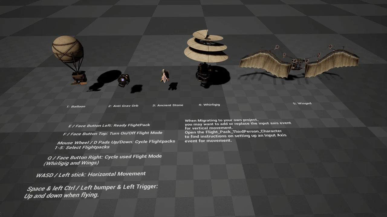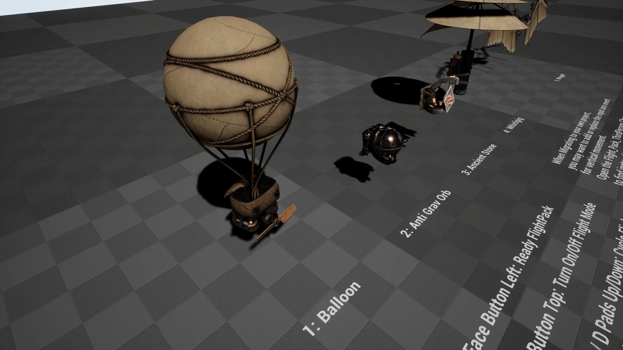 Discover five unique flight contrivances, each boasting distinct visual character and intricate details. From the elegant balloon pack with its simple propeller to the mysterious anti-gravity device housing unknown forces, and the ornate clockwork wings that flap with lifelike precision, every element is designed for visual impact and creative storytelling. For more flight-related assets, check out the Easy Flight Model.