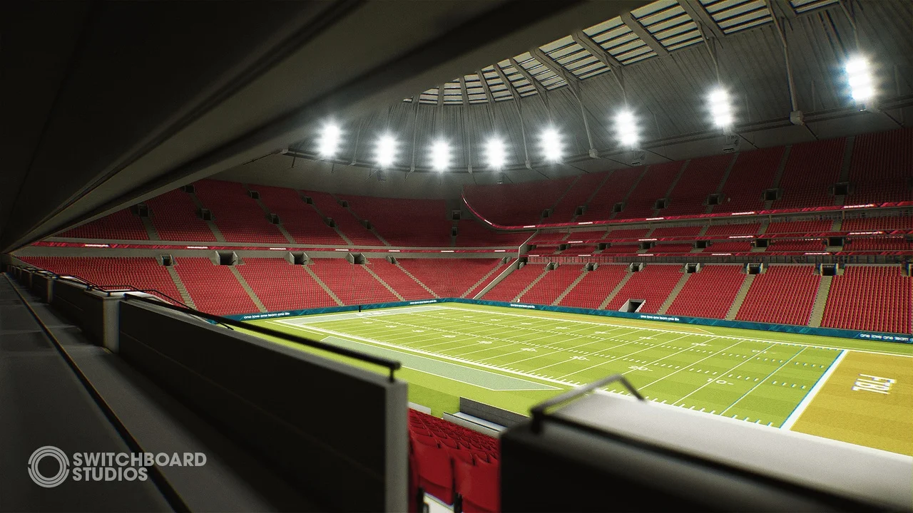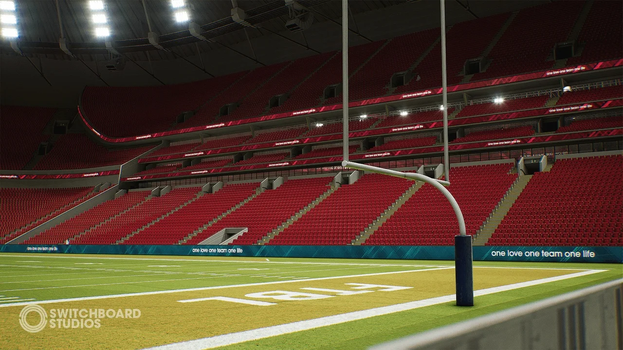 An over 50,000 seater stadium with a glass framed roof and stadium lights. Perfect for use in sports games, virtual production or sports cinematics! Contains assets relevant to Football ( Soccer) and American Football such as goals, and a physics corner flag!