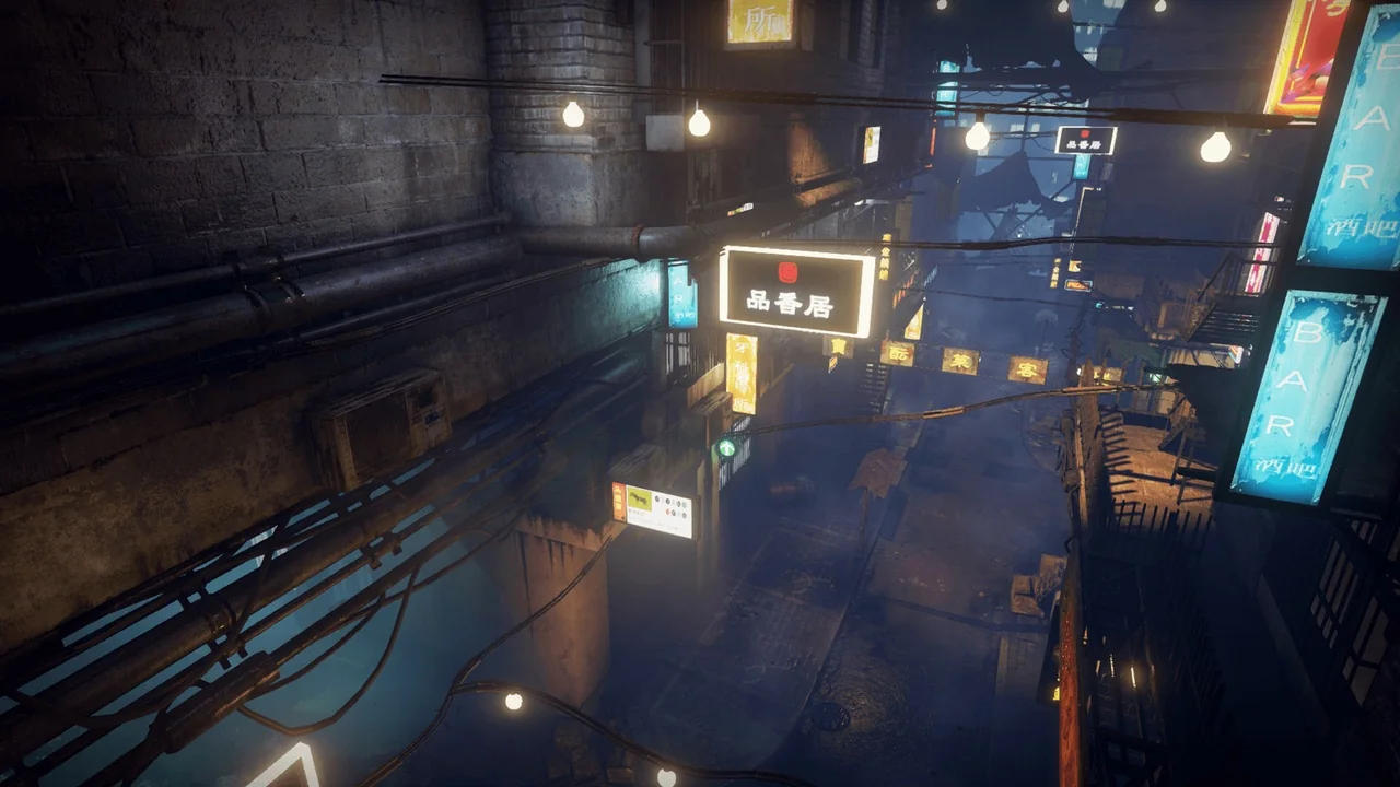 - High-contrast lighting with neon accents