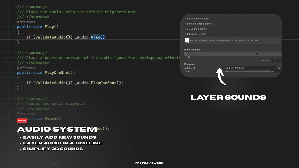 To enhance the sensory experience of the game, FPS Framework 2.0 includes an advanced, modular audio system. This system allows for the management of audio clips in a way that provides deeper 6D sounds. It supports custom events, giving developers maximum control over how and when sounds are triggered in relation to gameplay actions. This modularity means that audio behaviors can be adjusted for specific weapons, environments, or character actions without a one-size-fits-all approach.
