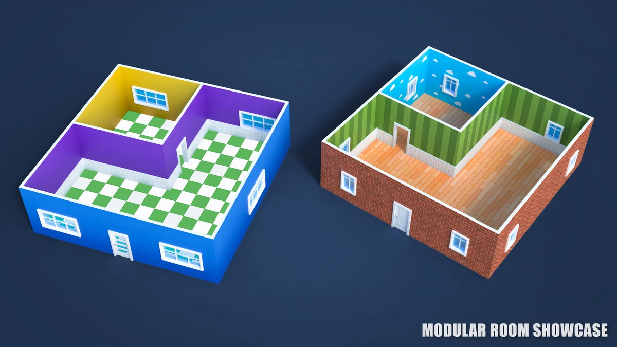 To facilitate the construction of varied layouts, the developer has included a modular wall and floor system. These modules are designed for flexibility, allowing for the assembly of any room configuration. The wall pieces are particularly versatile due to their three material slots, which cover the front, back, and edge of the mesh. This configuration enables the independent customization of interior and exterior colors, giving creators precise control over how a room looks from both the inside and the outside without needing separate assets for different sides of a wall.