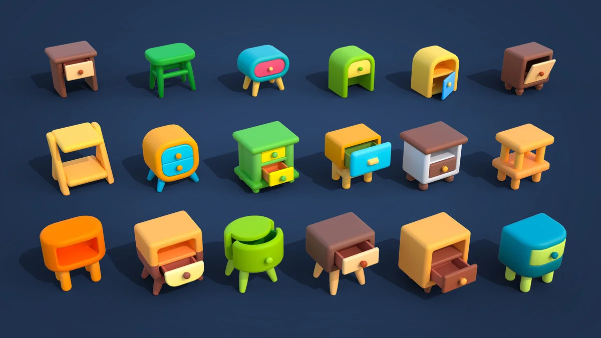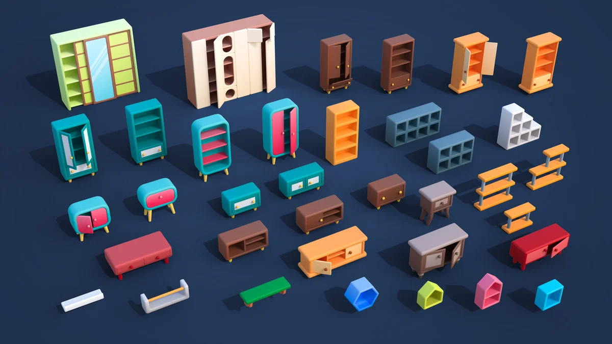The Furniture Cute pack focuses on providing a high volume of low-poly 3D models designed specifically for game engines. With 1000 unique assets, the collection allows for the creation of detailed interiors from scratch or the modification of existing scenes. A distinct functional feature of this pack is the interactivity built into many of the models. Rather than being static meshes, various assets such as cabinets, wardrobes, and desks are designed with movable parts. This allows developers to open doors and pull out drawers, creating opportunities for gameplay mechanics like hiding items or placing props inside storage units to enhance player immersion.