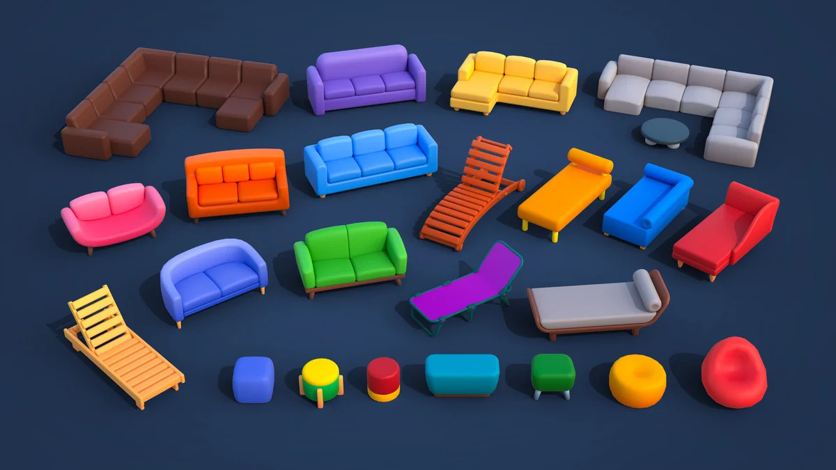 - Beds and Seating (132 items combined): The pack offers 40 different bed types, ranging from single and double beds to baby cots. For seating, there are 59 options including kitchen chairs, office chairs, children’s furniture, outdoor seating, armchairs, and poufs. The couch category adds another 33 assets, covering sofas and sunbeds.