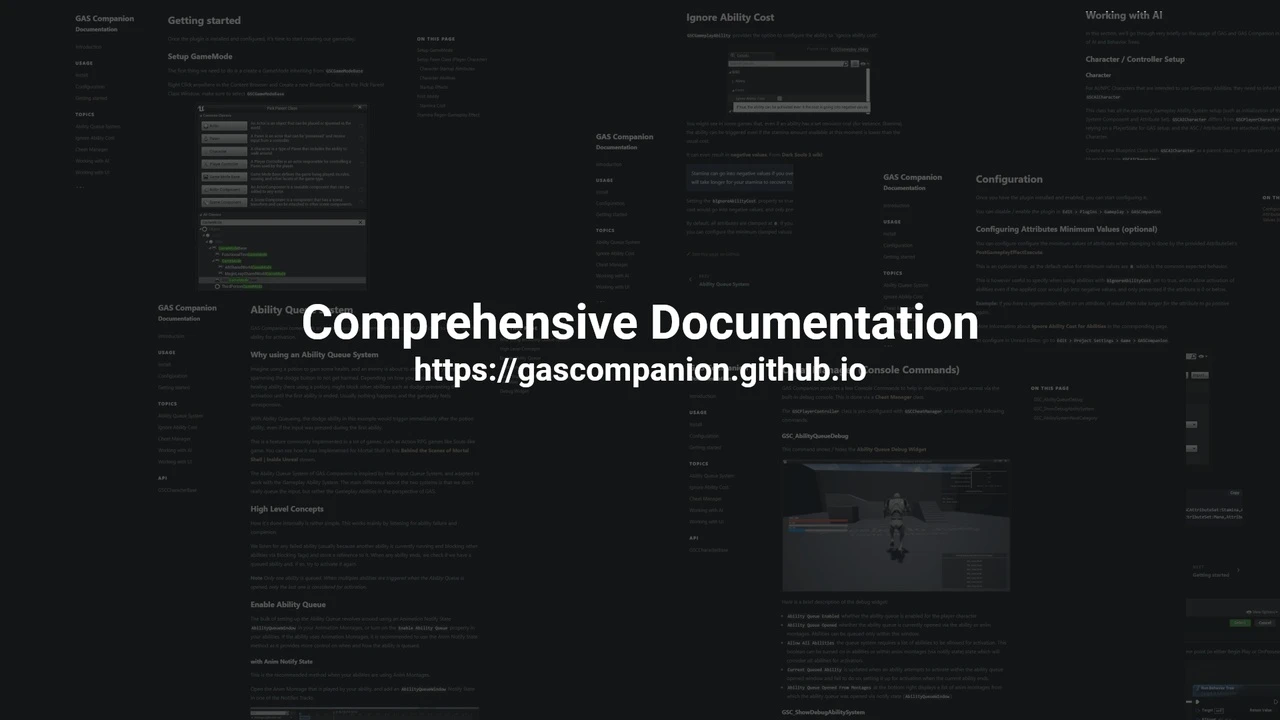 GAS Companion is an all-encompassing base for GAS (Gameplay Abilities System) powered projects, designed to cater to various project needs without dictating game design choices. It includes essential initial C++ setup, helpers, and additional features to kickstart new projects using Epic’s GAS plugin, widely used in games like Fortnite and Paragon.