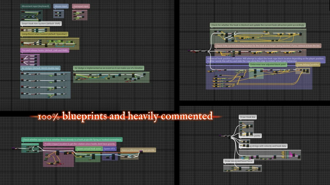 To make the movement look professional, the system features 30 handmade animations. These include multiple blendspaces for in-air movement, flips, and dodges. These animations ensure that every jump and swing looks polished and impactful. Finally, a large example map is included to demonstrate the full potential of the system.