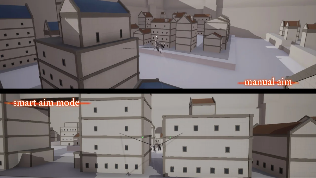 Aiming a grappling hook in the heat of battle can be challenging. To solve this, the developer included two distinct aiming modes. The traditional manual mode allows for precision by shooting exactly where the crosshair points. However, the smart aiming mode offers a more fluid experience for casual or fast-paced play.
