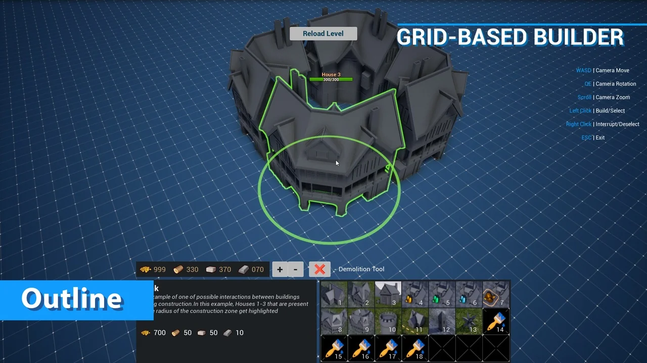 The asset also features a basic damage system for all constructed objects. Buildings can receive damage and track their health through HP values. Once a building’s HP reaches zero, it is destroyed. This adds a layer of tactical depth to any game utilizing these mechanics.