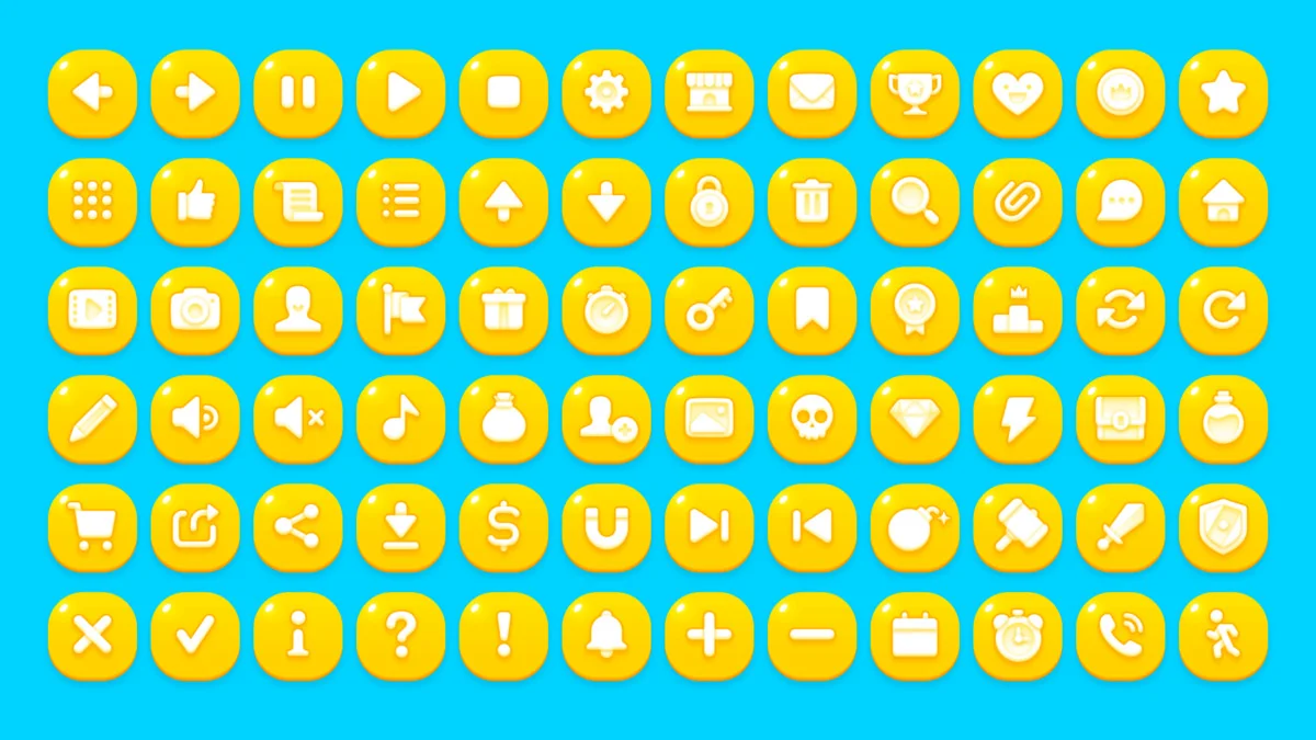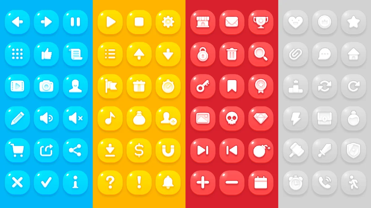 The core of this package consists of over 400 individual PNG sources. These elements cover a wide range of UI needs, from basic buttons to complex frames. Moreover, the collection includes 72 button icons available in four distinct colors: Blue, Gray, Red, and Yellow. This color variety allows for clear visual hierarchy and state changes within a game’s user interface. In addition, 72 pictogram icons are provided in multiple sizes, including 64×64, 128×128, 256×256, and 512×512 pixels.