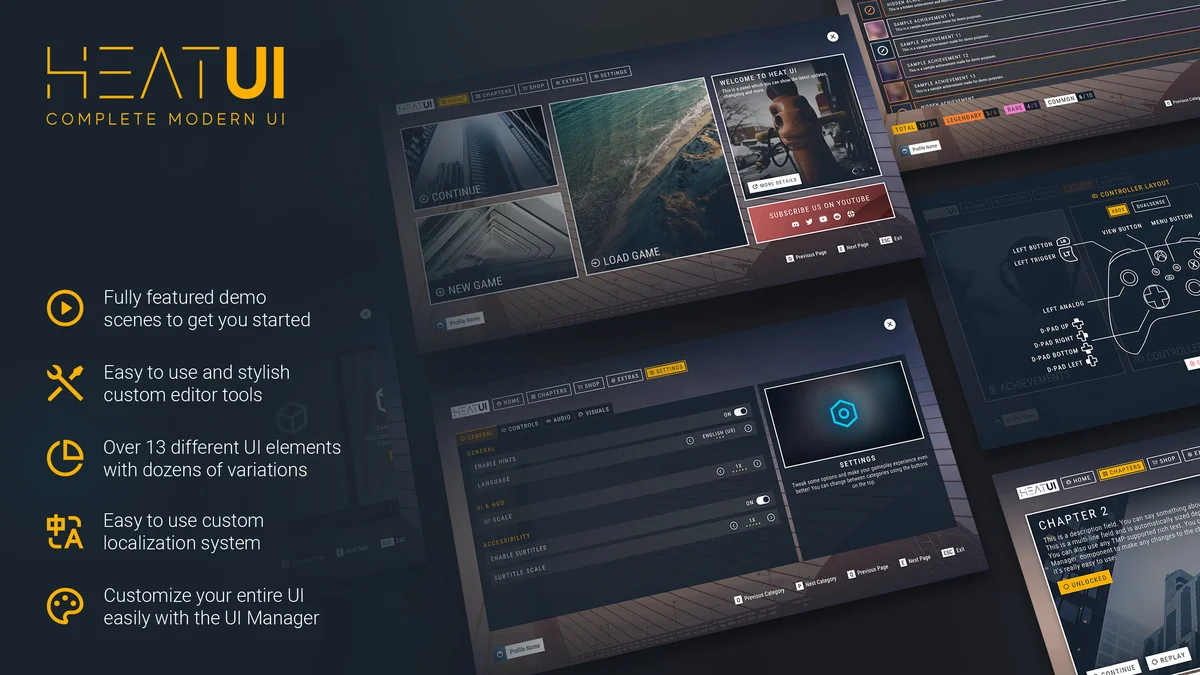 Heat – Complete Modern UI offers a professional and highly flexible interface solution for Unity projects. With its UI Manager, rich component library, and support for multiple rendering pipelines, it streamlines the UI design process. Whether you are building for PC or consoles, this asset provides the tools necessary to create a modern, high-quality user experience.