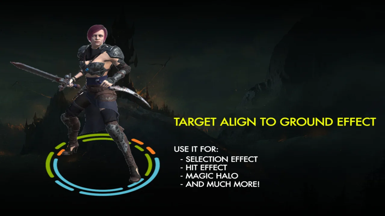 – Area of effect: target effect option which adds an aligned to ground animated graphic under a gameobject or character (similar to decals).