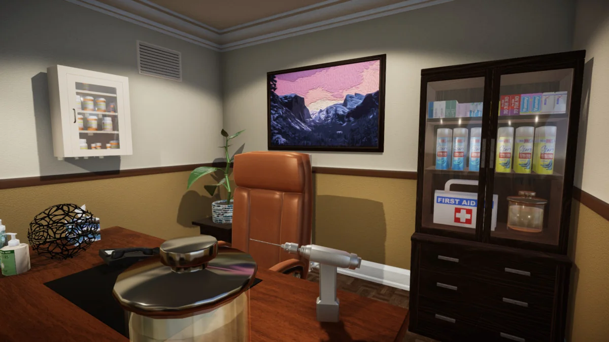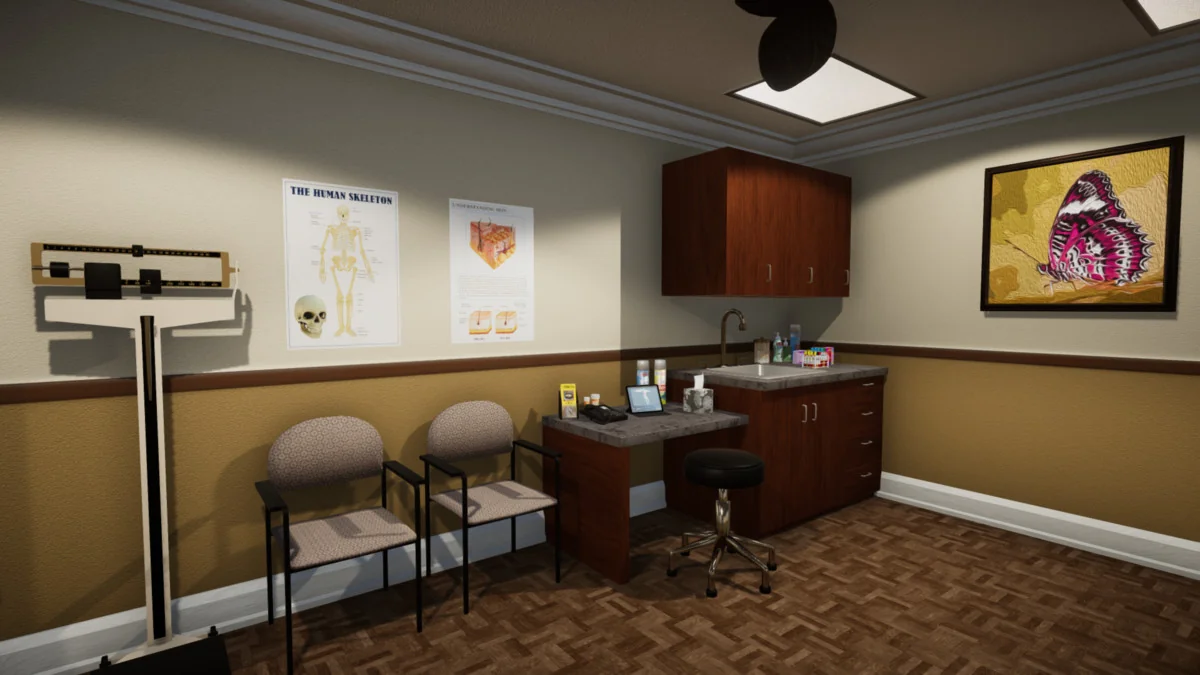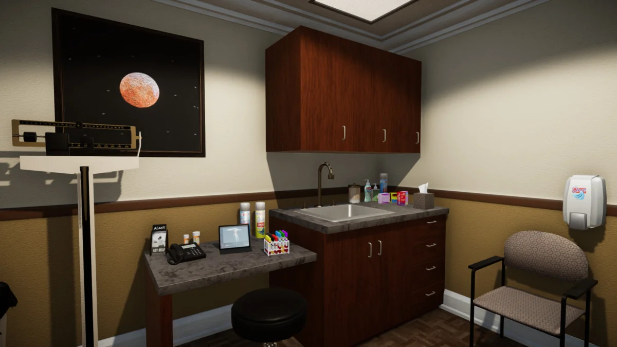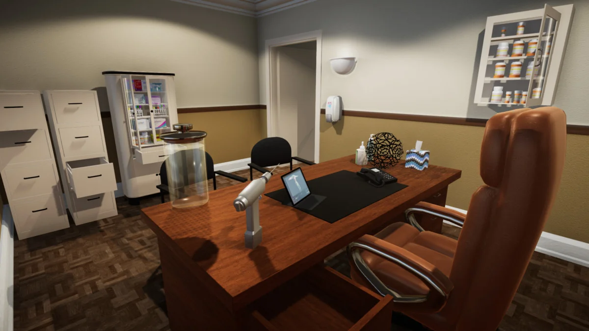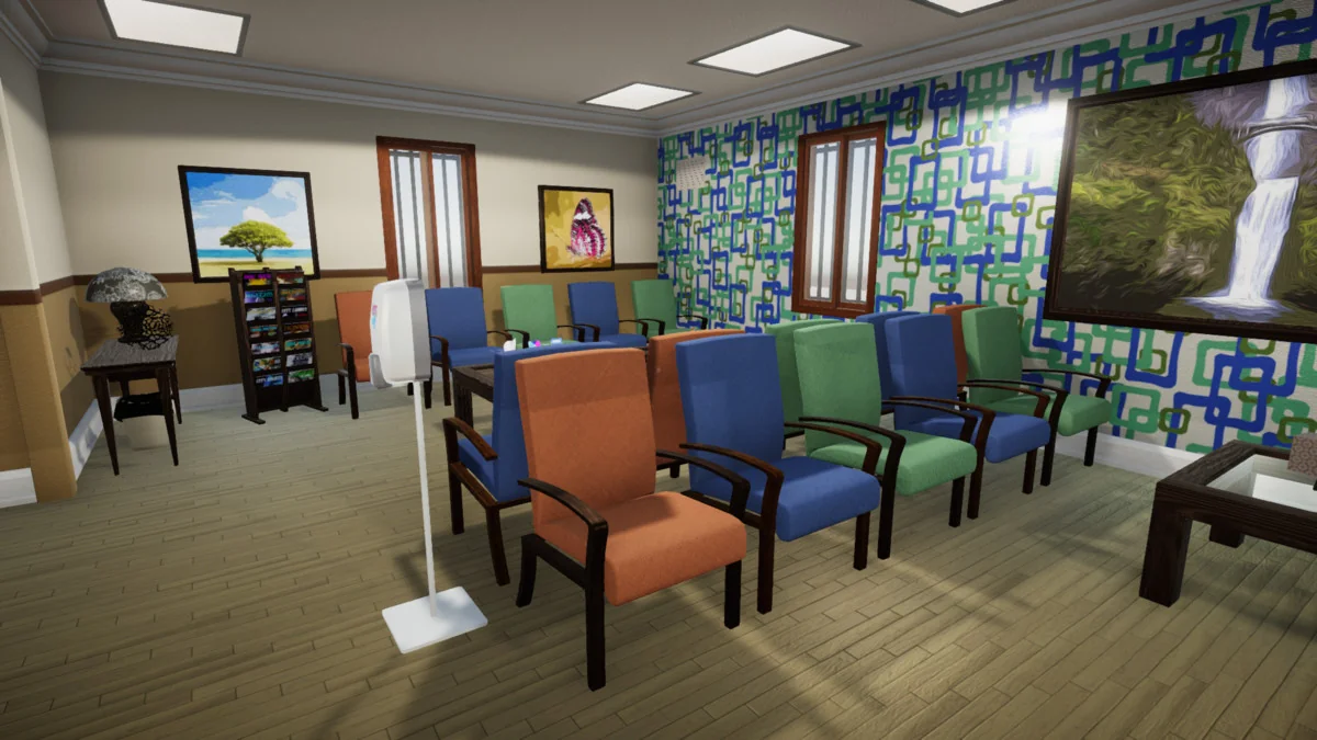 To populate waiting rooms and consultation offices, the kit includes 14 magazines, 12 pamphlets, and 5 posters, all featuring unique artwork to avoid repetitive textures. These can be displayed using the included wall-mounted pamphlet holders or tabletop stands. The atmosphere of a working office is further enhanced by 14 medication boxes and bottles, also featuring unique artwork, and two types of sanitizer dispensers for placement in hallways and rooms.
