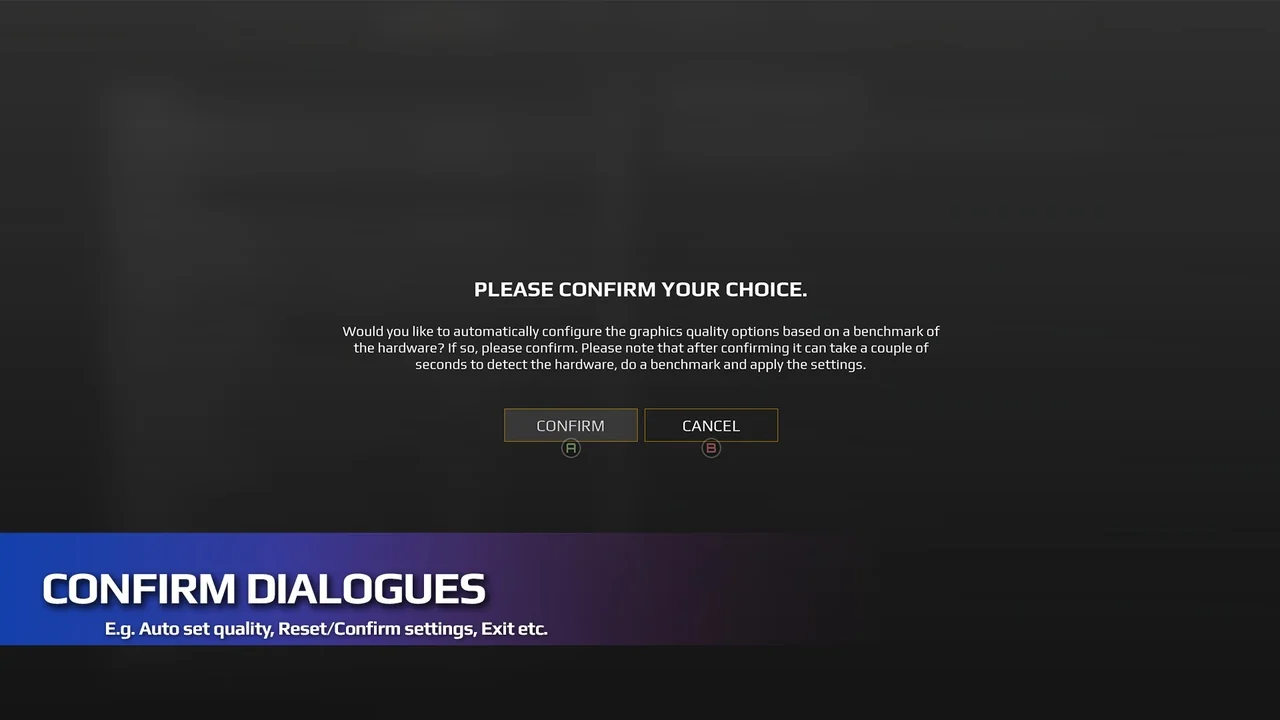 Tabbed layouts keep the interface organized, and that structure works well when different settings need to stay separate but easy to reach. Sliders and tooltips give the player direct control and added context, while confirmation dialogues can be used when a change needs a clear check before it is applied.