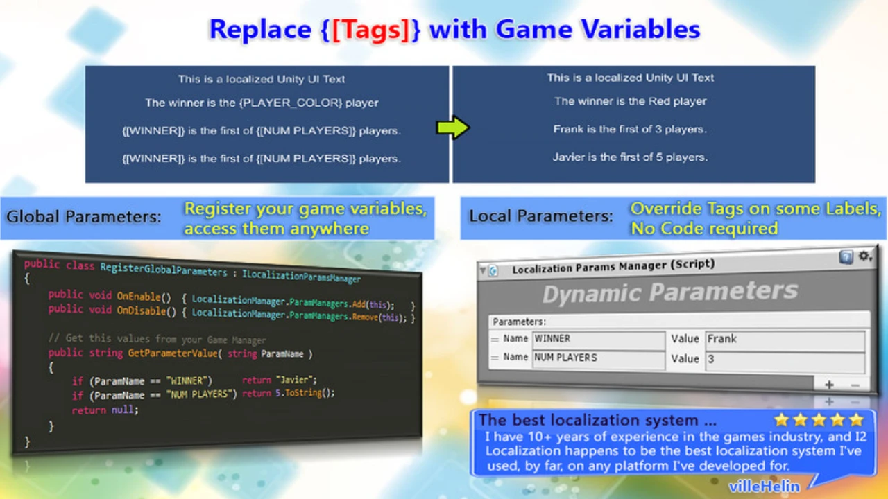 - Callbacks and Parameters: Translations can be modified to insert Scores, Names and Game Variables.