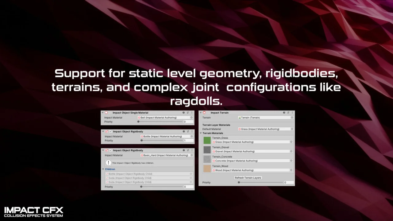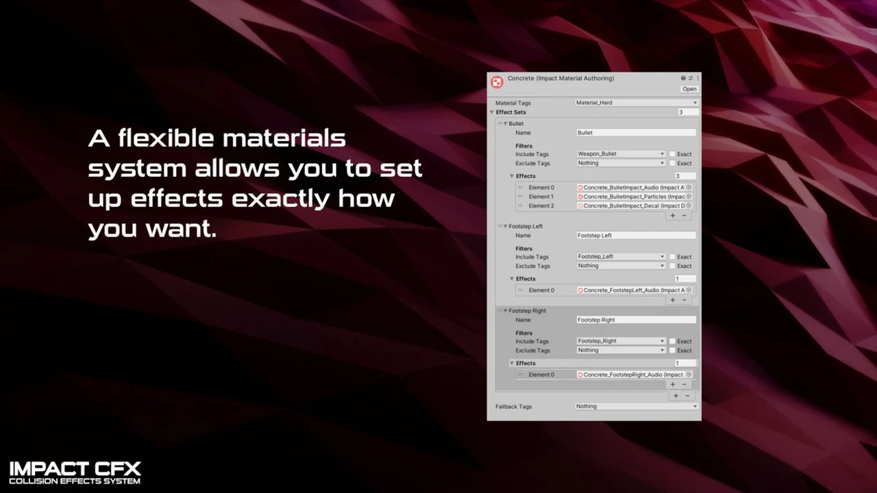 Impact CFX is a powerful and flexible material-based collision effects system for producing audio, particle, and decal effects from physics collisions and raycasts.