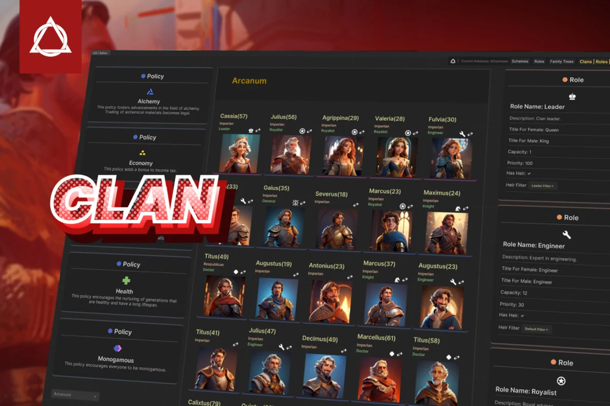 Beyond simple dialogue and text-based fiction, this tool incorporates deep social systems that manage families, clans, and broader cultures. It provides a structured approach to defining policies, roles, and cultural identities within a game world. These social structures are supported by features like marriage systems and population growth mechanics, allowing characters to develop and evolve over time within their respective lineages. The system manages runtime characters and their relationships, creating a persistent social web that can influence the story progression.
