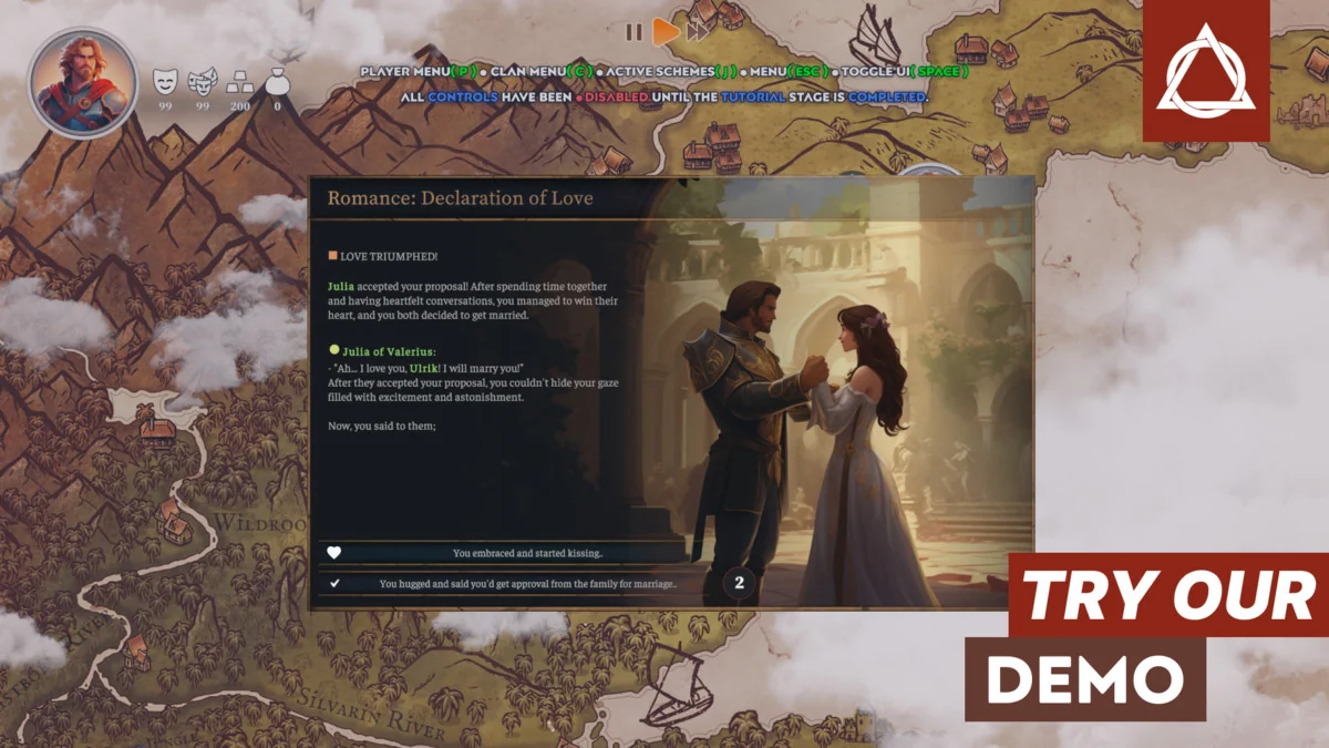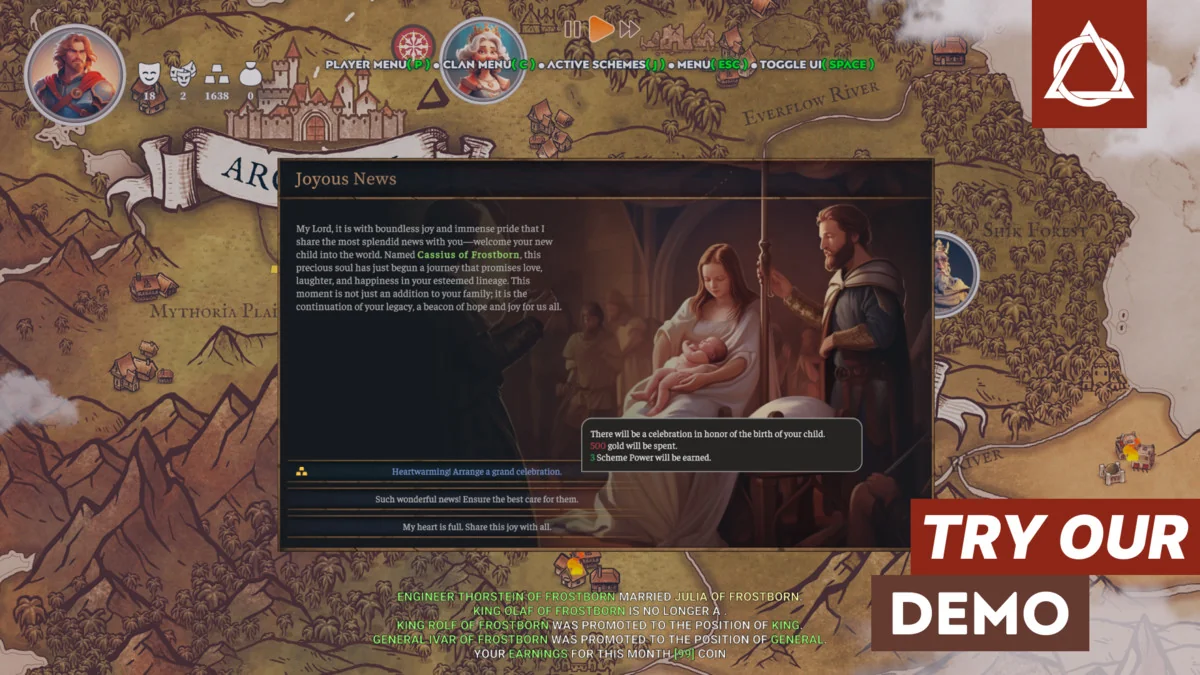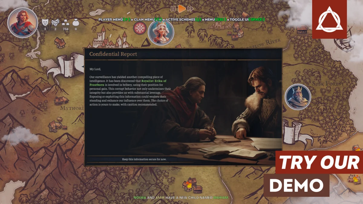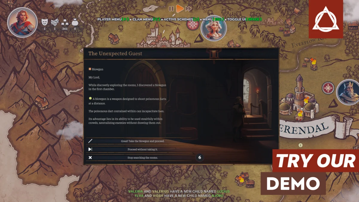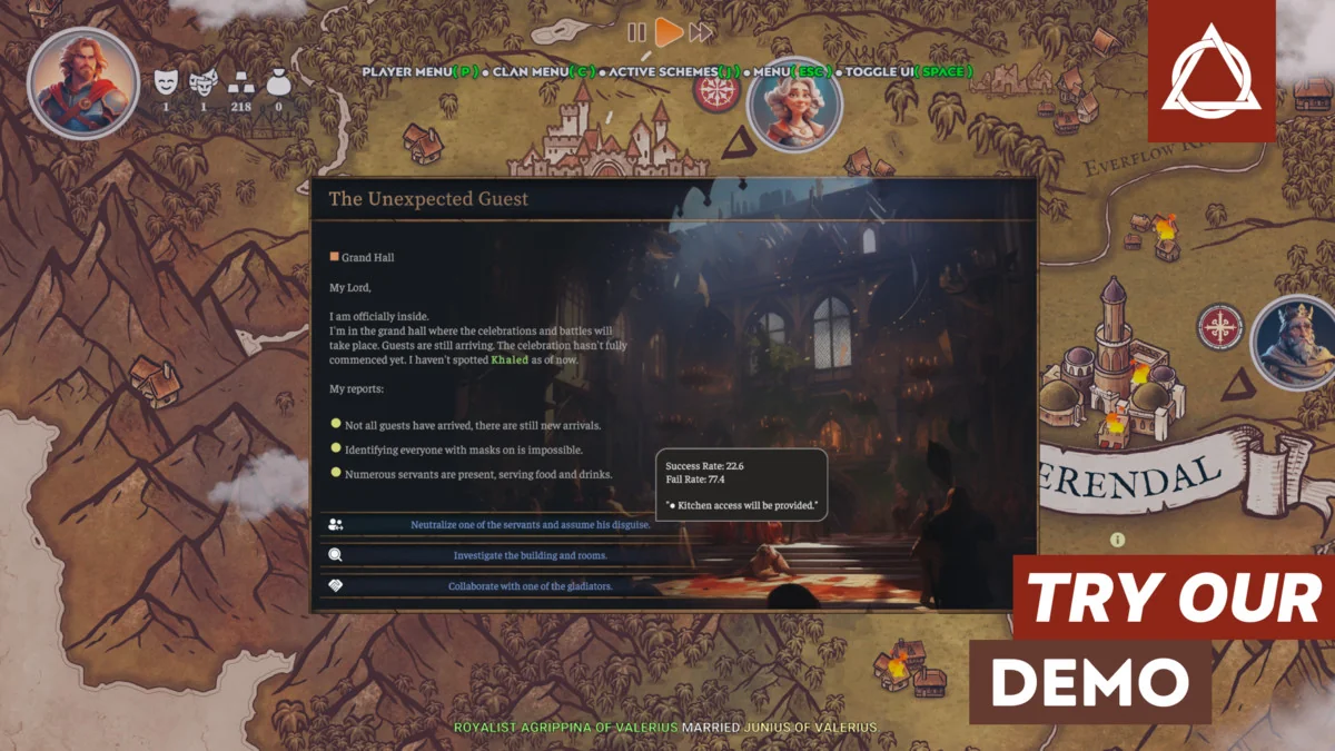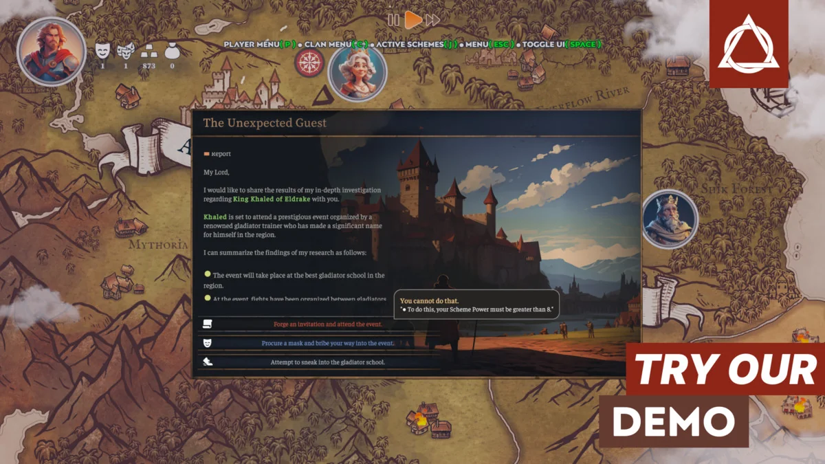 To add depth to these interactions, the system includes an AI component that enables characters to execute schemes against one another or against the player. These behaviors, such as assassination attempts or other political maneuvers, are handled by the AI logic to create a more reactive game world. This systemic approach to AI behavior ensures that the narrative is not just a static script, but a reactive environment where characters have their own agendas and methods of interaction.