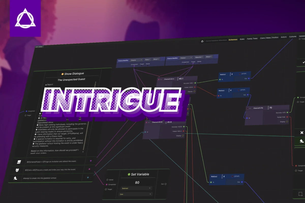 Intrigues functions as a narrative and social framework designed to facilitate the creation of high-fidelity interactive fictions within the Unity environment. At the core of the tool is a visual, node-based editor that allows developers to map out complex story flows without writing code. This system supports multi-faceted narrative structures, allowing for multiple introductions, varied development paths, and diverse conclusions. By using a node-based interface, the progression of a story can be dictated by specific choices, variable changes, or randomized chance, making the narrative path dynamic rather than linear.