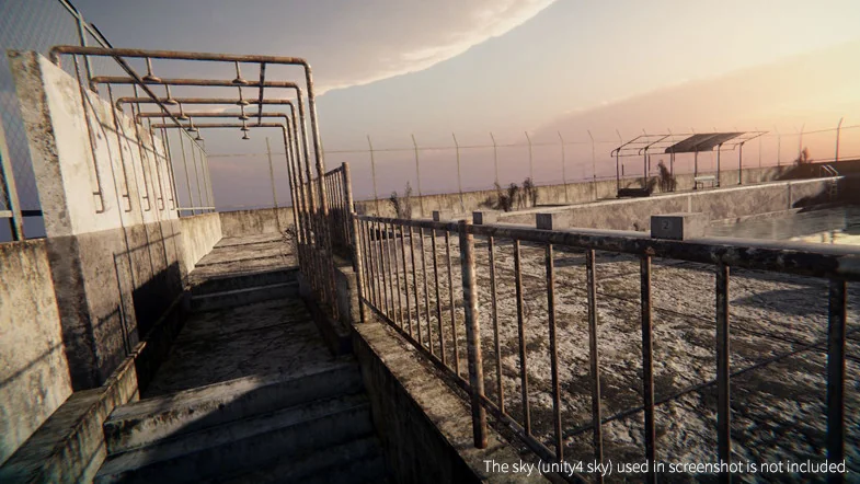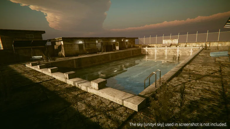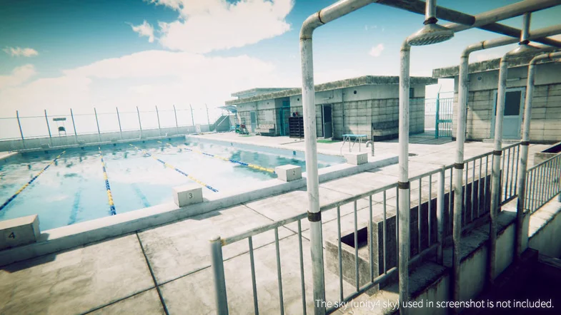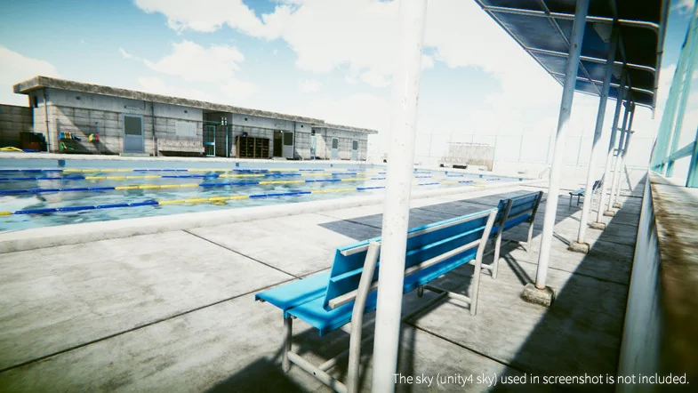 The Japanese School Swimming Pool asset is designed to provide developers with a flexible toolkit for constructing a specific and recognizable architectural environment. The package is built around 79 unique meshes in FBX format, which serve as the foundation for the 196 available prefabs. These components allow for a modular workflow, where individual pieces can be arranged to fit the layout requirements of a specific level or cinematic shot.