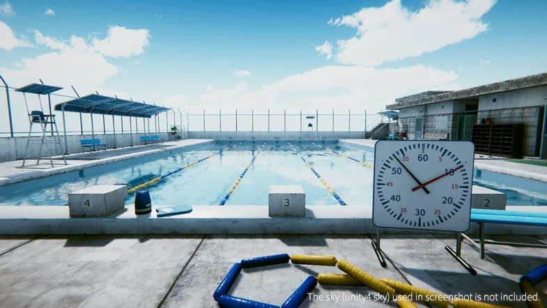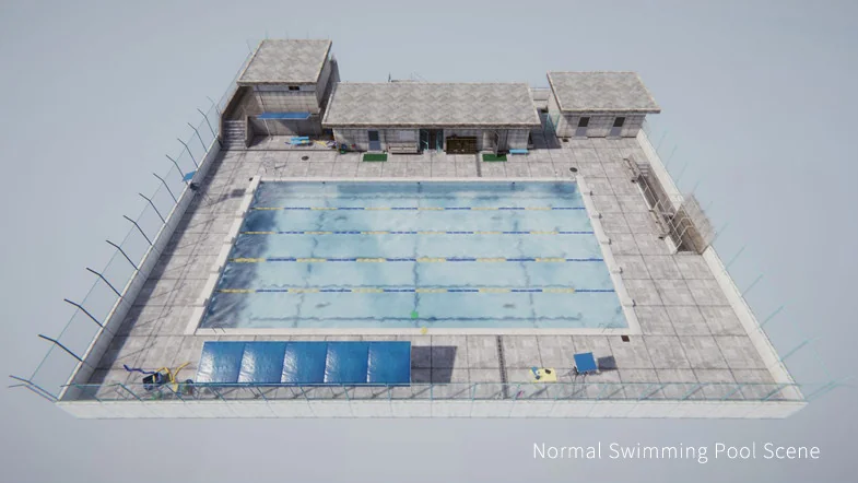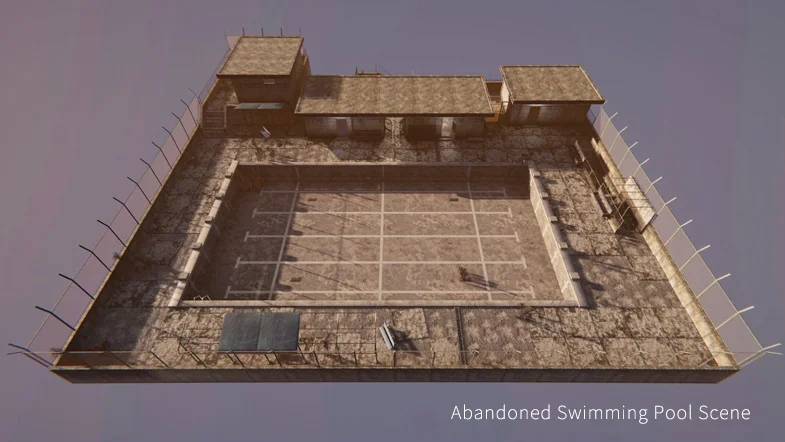 Two demo scenes are provided as part of the package, serving as practical examples of how the 578 total assets can be assembled. These scenes demonstrate the intended layout of the pool area, including the placement of fencing, tiling, and academic infrastructure, offering a baseline for further customization.