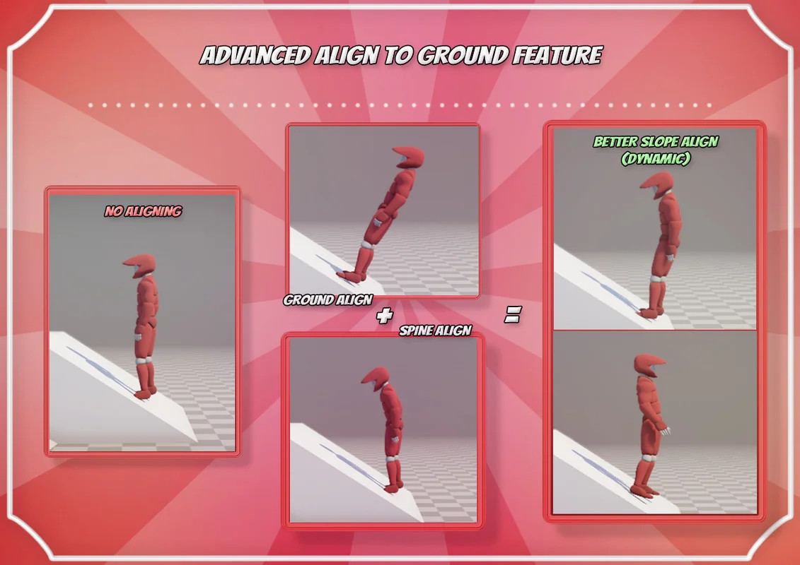 One of the primary functions of the system is its ground adjustment capability. This feature aligns the character model to the terrain by rotating the whole model in conjunction with specific spine rotation alignment. This process is intended to simulate a character finding their balance pose while traversing uneven ground, such as running up or down slopes or across tilted surfaces.