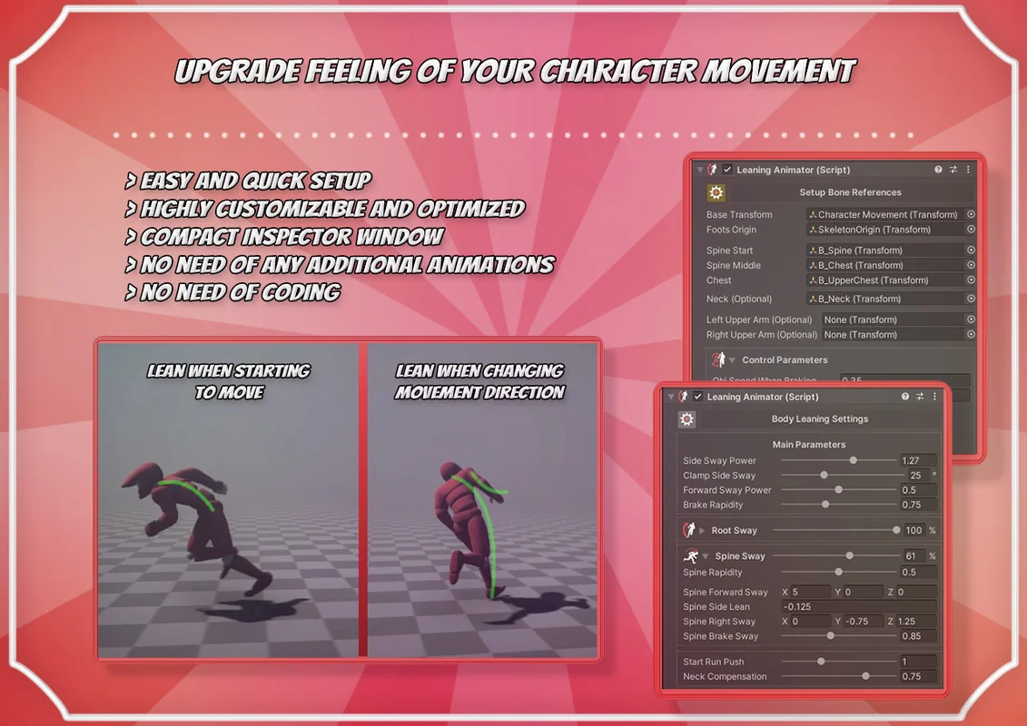 Leaning Animator is designed to enhance the physical presence of bipedal characters by applying procedural leaning algorithms during movement. Rather than relying on static animations, the system calculates adjustments for the whole object, spine bones, and arms dynamically. This approach aims to improve the visual weight and responsiveness of characters as they transition through different movement states.