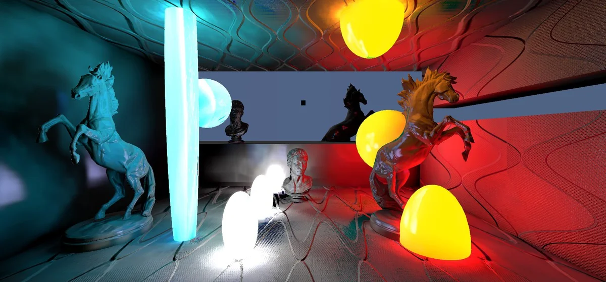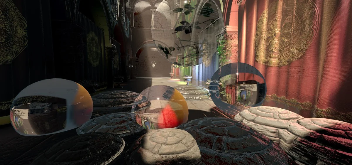 The description also makes the lighting inputs clear. The system uses sun and mesh-shaped light sources. That gives the setup a straightforward structure: a sun source for broad lighting and mesh-shaped sources for scene-specific emitters. The emphasis stays on real-time interaction with the level itself, rather than on post effects that depend on what the camera currently sees.