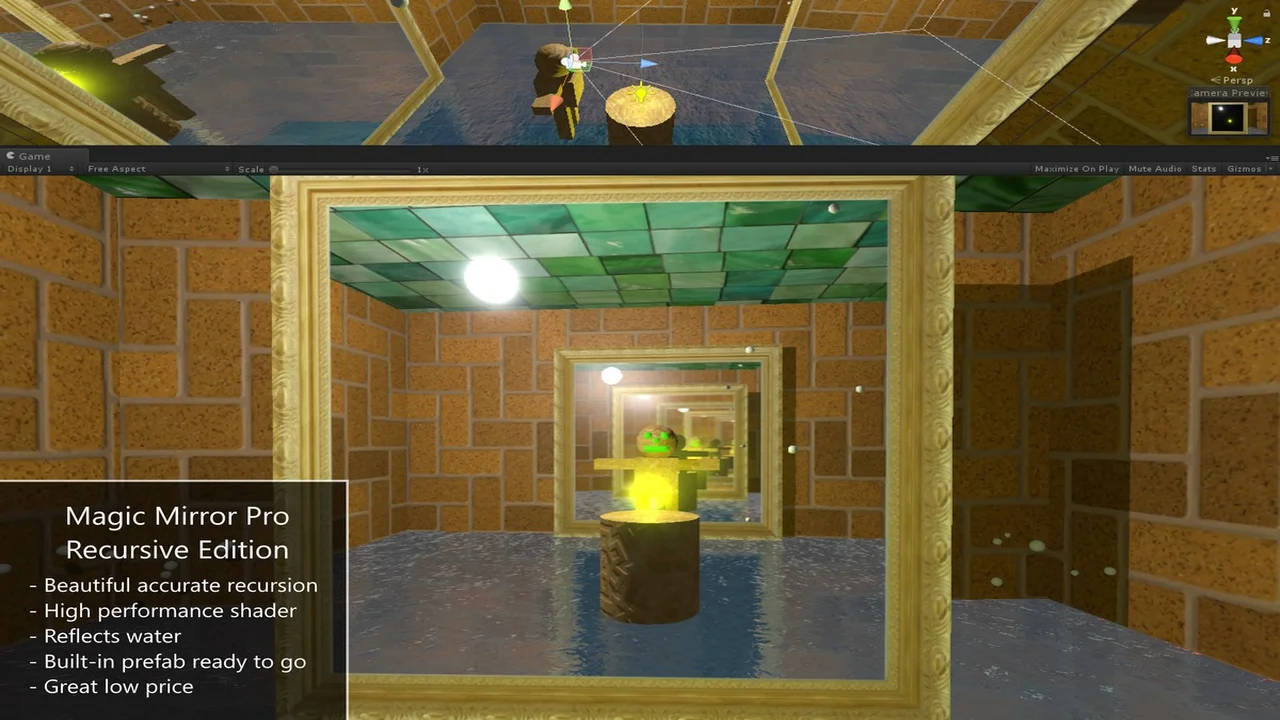 Recursive reflections for Unity are finally here! Magic Mirror Pro – Recursive Edition is the first asset to provide proper recursive reflections. A fix for recursive water reflections is also included!